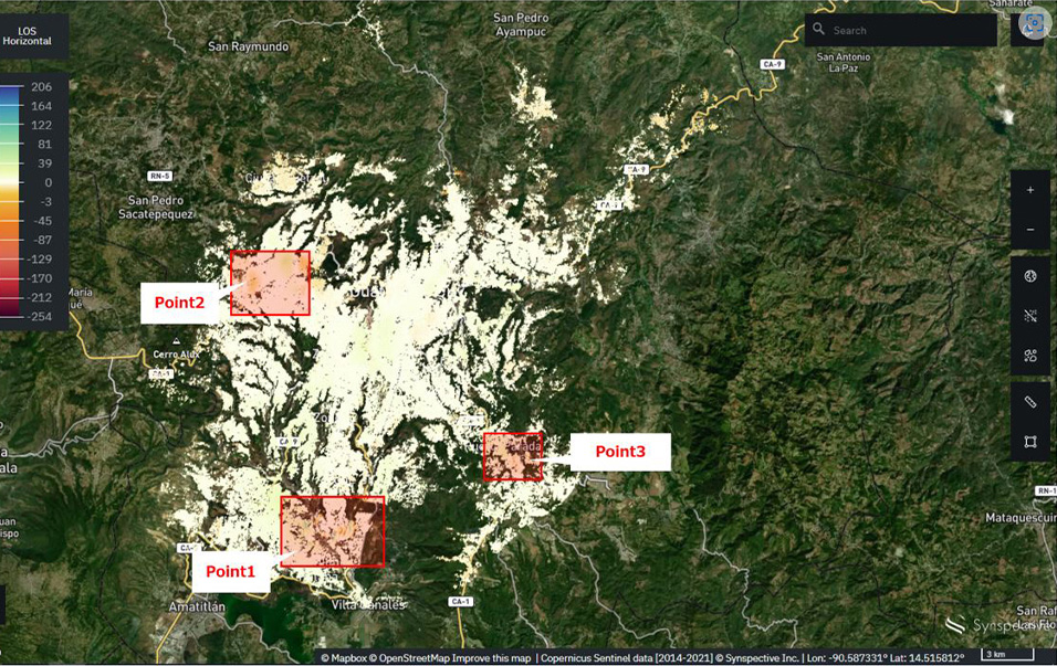 今回の事業では、SAR衛星画像データを用いて地盤変動をモニタリングし、首都グアテマラシティとその郊外で約3年間(2018年7月~2021年6月)の地盤変動解析を行った。都市部を中心に140万点以上を超える計測点での時系列変動データの分析の結果、既存の行政測量機関では認識していなかった3か所の新たな陥没リスク箇所が発見できた。グアテマラシティでは、最大沈下箇所で約-292mm、最大隆起箇所で+88mmと、地表面が変動していることも確認できた。これは、潜在的な地盤変動リスクの早期発見や新たな防災マネジメントシステムの構築を手助けする。現地政府に新たな測量技術が提供され、効果的および効率的に実運用業務に取り入れられることで、グアテマラ国民の命や財産を守ることにつながる。