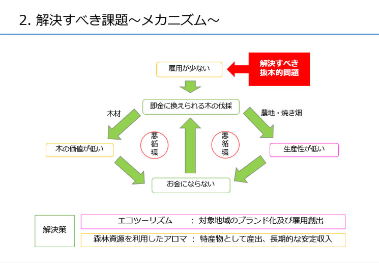 私たちのアイデアは、流行に敏感な先進国の若年女性を対象とした、付加価値が高く収益性が見込める森林資源を活かしたエコツーリズムとオーガニックなアロマオイルの製造販売をおこなうことで、過剰な焼畑農業を行っている農家の方々に新たな雇用機会を提供し、森林保全への貢献を目指します。