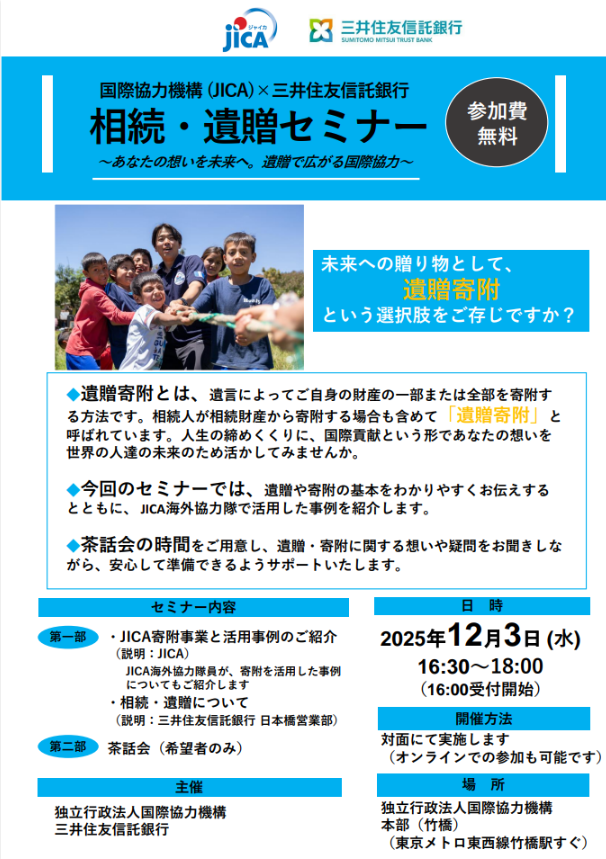 - JICA×三井住友信託銀行「相続・遺贈セミナー」(12月3日)を開催します