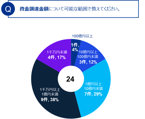 2024年度のモニタリング調査によると、JICA Bizに参加した企業の約25%が資金調達ニーズを持つと回答しました(表1の左)。また、資金調達手段としては、資金調達の手段として地方銀行や信用金庫等の金融機関からの融資が最も多く、助成金・補助金が続いていました(表1の右)。そのうち資金調達を実現した会社に資金調達額を問うたところ、「1千万円~1億円未満」の調達が38%で最多となり、「1億~10億円未満」が29%、「10億円以上」が12%という分布結果でした(表2)。