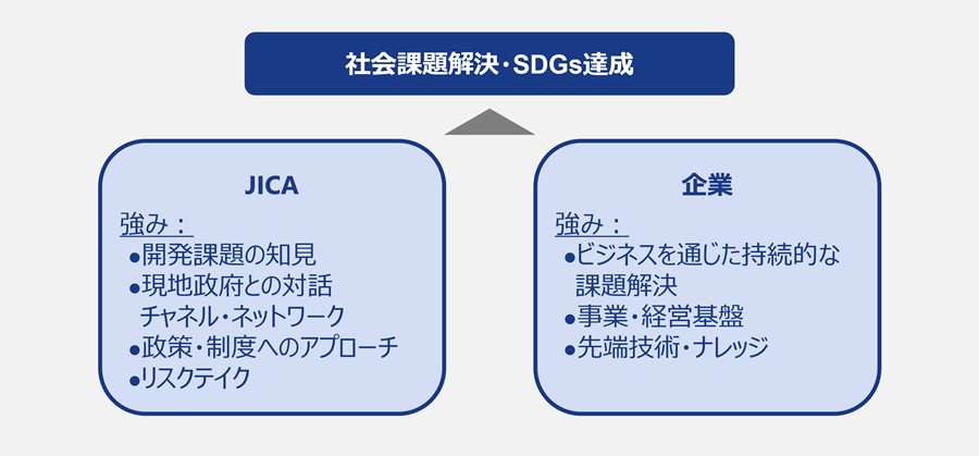 例えば、JICAが進めるODA事業において企業のリソースや知見を活用するような取り組みや、JICAと企業が並行/共同で事業を実施することでシナジーの創出を目指す取り組み、企業が社会課題解決型事業を促進する際のボトルネックをヒントに相手国のニーズも踏まえてODA事業を形成することで、市場の創造に貢献する取り組みなど、様々なあり方が検討され具体的な活動が進んでいます。