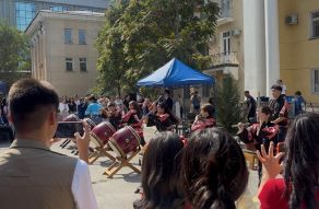 ・大江戸太鼓やJICA関係者によるバンド’Суши бармак(スシ バルマック)’の演奏に釘付けの来場者たち