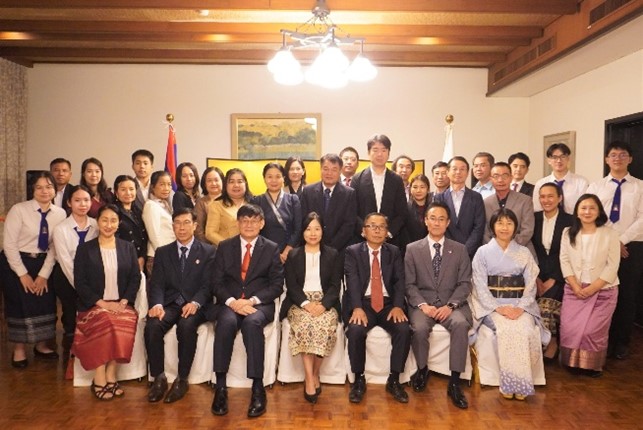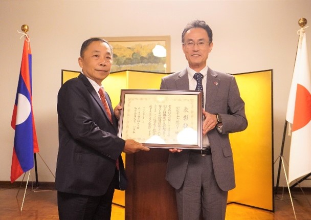 大使公邸で開催された授与式には、ラオス日本友好協会会長で前教育・スポーツ大臣のプット・シンマラヴォン准教授、ラオス国立大学学長のデサノラット・セネデュアンデット教授、JICAラオス事務所の小林美弥子所長をはじめ、多くの来賓が出席しました。