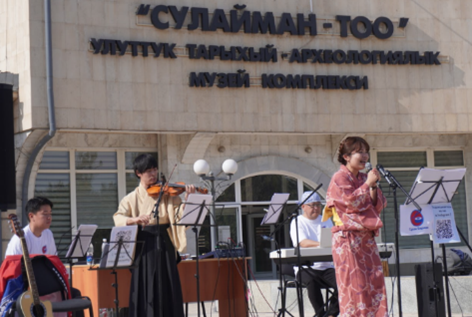 締めくくりとなるオシュでは、大使館主催の「JAPAN DAY」の一部として開催され、上記プログラムに加え、オシュドラマシアターでKRJCの和太鼓グループ「大江戸太鼓」、スライマントー博物館でJICA/JOCV/KRJC有志による音楽隊「スシバルマック」、それぞれのコンサートも行われました。これらの文化活動は、JICAキルギス事務所およびJOCVの皆さまの多大な協力により実現し、学校調整や展示・ステージ運営など各場面で支援をいただきました。おかげで3都市それぞれで充実した文化交流が可能となりました。