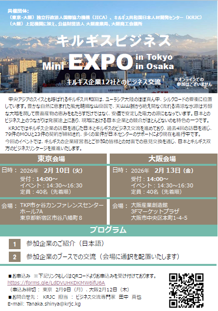 キルギス共和国日本人材開発センター:【参加者募集!】キルギス企業とのビジネス交流会「Mini EXPO in Tokyo & Osaka」(2/10東京 ・ 2/13大阪 開催)