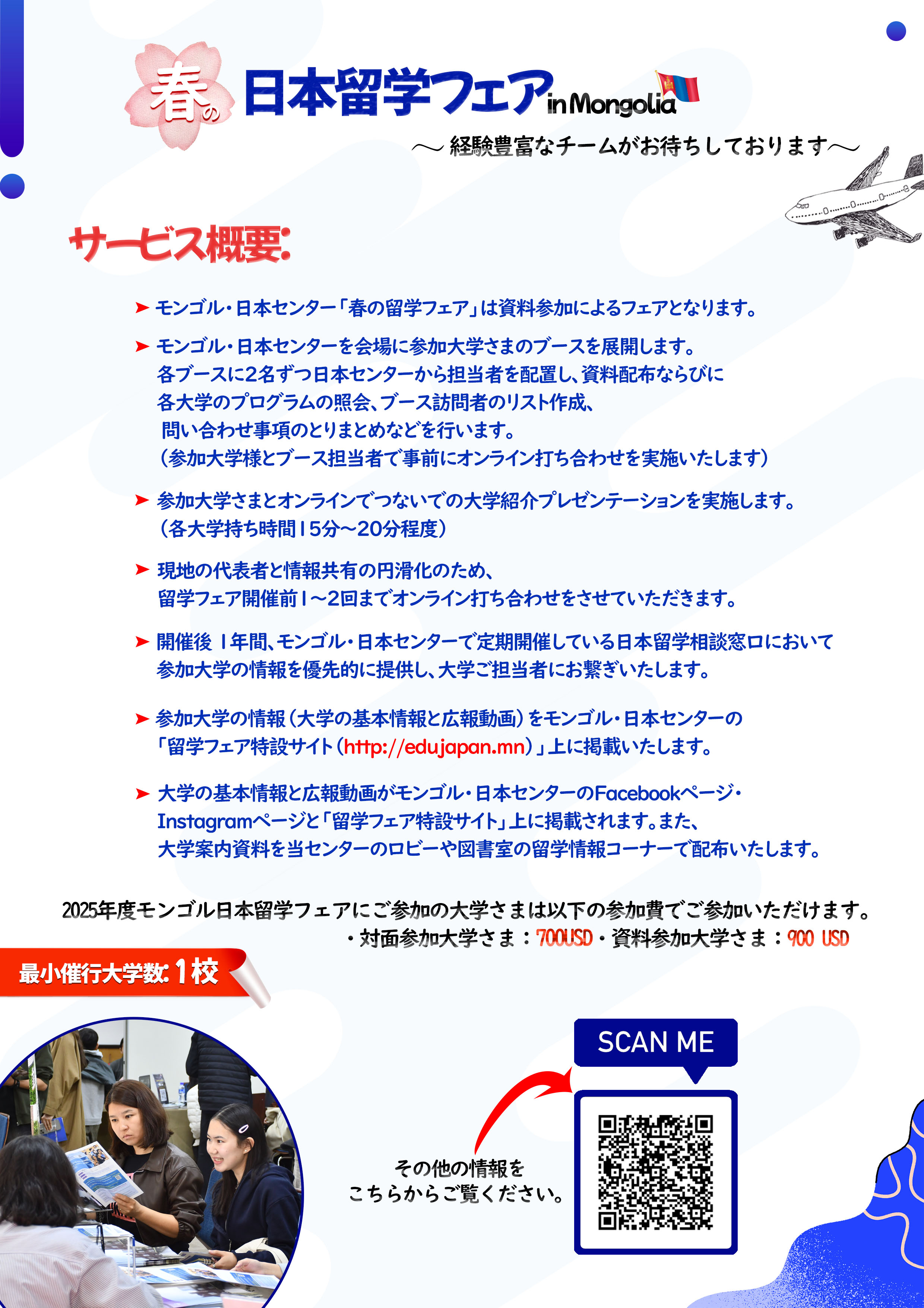 モンゴル日本センターでは、日本への留学に関心のある現地学生と留学を積極的に受け入れようとする日本の大学を繋ぐことを目的として、オンラインでご参加頂ける春の留学フェアを実施いたします。(対面でご参加頂ける各国日本センター主催:秋の留学フェアにつきましては、4月頃を目途に、このページでご案内予定です。)