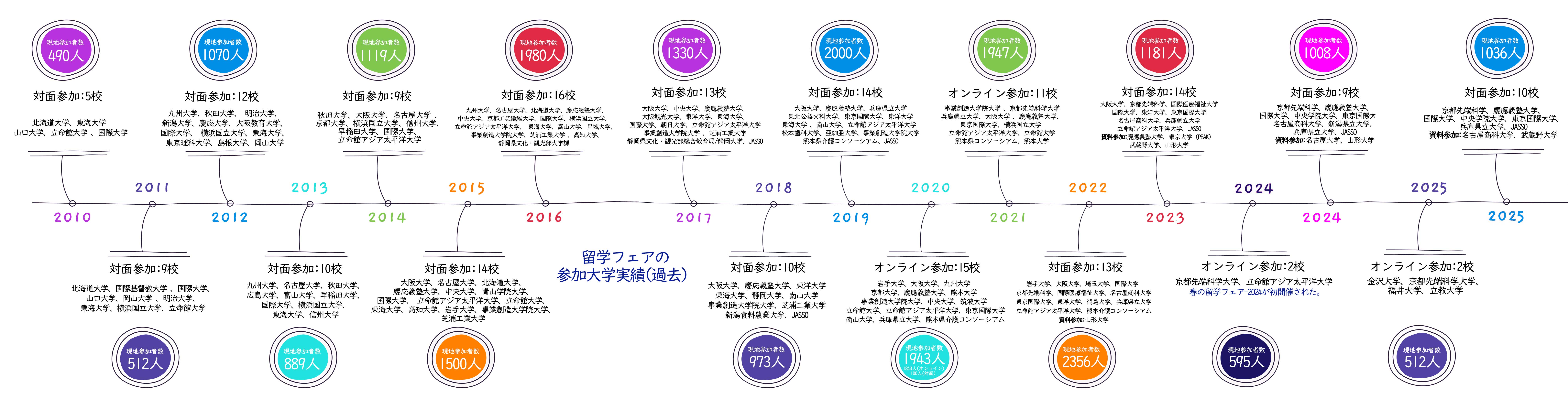 また、各大学のご担当者にはイベント会場と日本をオンラインで繋いでご講演いただけます。開催前に現地の担当者と打合せを行いますので、例えば、講演内容を全て事前に伝達し現地の言語だけで講演を依頼する、または、日本語話者の講演をその場で通訳しながら実施する等、よりご希望に沿った形を追求することが可能です。 どうぞ奮ってご参加下さい。
