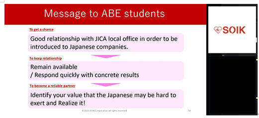 続いて、実際にABEイニ修了生の採用・ビジネス連携の経験があるヤマハ発動機株式会社および株式会社SOIKの2社から、事業の紹介、採用や連携に至るまでのプロセス、さらに採用時に重視する点などについて発表がありました。これらの情報は、参加したABEイニ修了生にとっては、今後のキャリアの中で日本企業での就職や連携を考える際に大いに参考になるものでした。