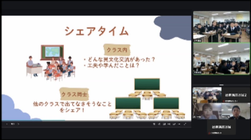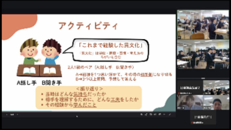 それを体験するために、まずは2人1組のペアになり、一人は、その異文化体験で出会った人を演じ、もう一人は質問を通して、どんな特徴を持つ人やグループなのかを推測するというものでした。その後、相手を理解するためにどんな工夫をしたかを、グループでシェアしました。最後に代表で紹介してくれた生徒からは、「自分の考えや思いを相手にそのままぶつけたら相手が悲しそうでした。それぞれに考えの違いがあるから、自分の意見が正しいとか、自分がこうだと思ったとしても、それをそのまま相手にぶつけちゃうのはだめなんだと学びました。」という発表をしてくれました。異文化理解と聞くと、一見、外国の違う文化について想像しがちですが、実は普段の生活でも体験しているということをあらためて知り、生徒の皆さんも異文化理解についての認識が新たになり、さらに理解度が深まったのではないでしょうか。