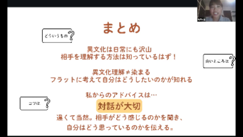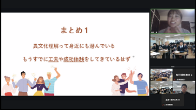 このような経験は自分がマイノリティになるという異文化に身を置くことで初めて気づくこともありますが、最初のアクティビティで学んだように、日本にいても、実は相手を理解する工夫は日常生活でも体験しています。学校の先生によると、このアクティビティがとても楽しかったという感想が多かったようで、実際に、活発に参加する生徒の姿が数多く見られました。生徒の皆さんも、これからもたくさんの異文化に触れ、新井さんのメッセージにもあった「対話」をたくさんすることで、お互いを理解するさまざまな方法を習得して、世界に羽ばたいてほしいです。