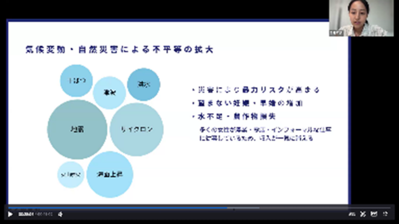 - ジェンダー問題だけでなく、インフラ整備や海面上昇などの環境問題を可視化して解決していくことが大切だと思った。