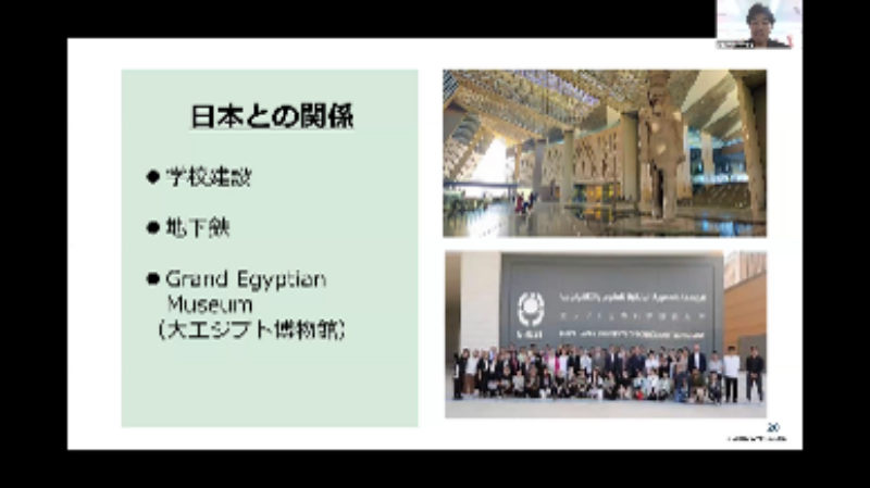 さらに、日本とエジプトのつながりを感じるニュースとしては、日本が建設支援に関わった大エジプト博物館のオープンが記憶に新しいですが、逢坂さんはプレオープンに行けたとか。そして、なんと!エジプトから遠く離れた青森県の八戸市美術館では、ちょうど「古代エジプト美術展」が開催されており、この出前講座の前に数人の生徒がこの美術展を見に行ってきたということでした。エジプトへの関心を高めて講座に参加する生徒がいたことが嬉しいですね。日本側からもその「古代エジプト美術展」の様子や日本の名所などを紹介し、特に日本のアニメの話がでると、エジプトの何人かの生徒はモニター前に出てきて、アニメやキャラクターの名前を話してくれるなど、日本アニメの世界的な影響力の高さにあらためて驚かされました。