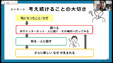 最後に安則さんからは、「考え続けることの大切さ」というメッセージがありました。「なぜ?」という疑問(気になったこと)をまずは調べ、知ったことを人に話す過程で、さらに新しい「なぜ?」が生まれ、また調べる、という「考え続ける」「自分の意見を話す」というサイクルを習慣にしてみてほしいという素敵なアドバイスをしてくれました。