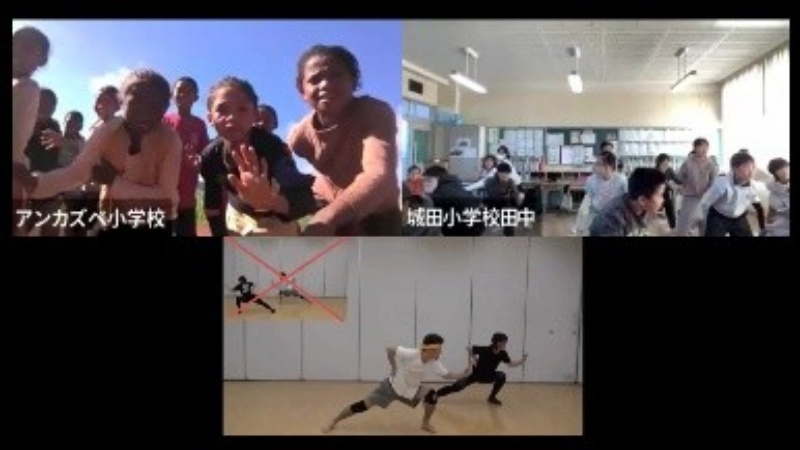今回の交流は、日本式運動会の雰囲気をマダガスカルの子どもたちにも体験してほしいという城田小学校の先生のアイデアから始まりました。そこで、自己紹介の後はラジオ体操と南中ソーラン、そしてマダガスカルの伝統的なダンスをみんなで一緒に踊りました。