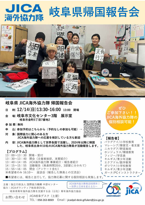 岐阜県出身で、開発途上国でJICA海外協力隊として活動してきた10名が、2年間の活動を通じて得たことや、現地での生活などについて報告します。