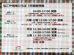 7月は、なごや地球ひろばは以下のとおり時間を短縮して開館しております。ご理解のほど、よろしくお願いいたします。