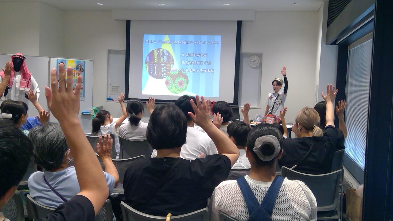 初めに、参加者の皆さんは、世界のさまざまな衣服に関するクイズに挑戦!会場には民族衣装を身にまとったマネキンが置かれており、その衣装を見ながら回答する問題もありました。頭を悩ませながら、元気に手を挙げて、たくさんの問題に答えていただきました。