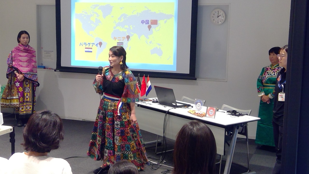 その後、中国、ケニア、パラグアイで活動したJICA海外協力隊経験者が、それぞれの民族衣装を着て登場。身にまとった民族衣装の特徴や、それを手に入れた経緯などを現地の写真と共に紹介しました。