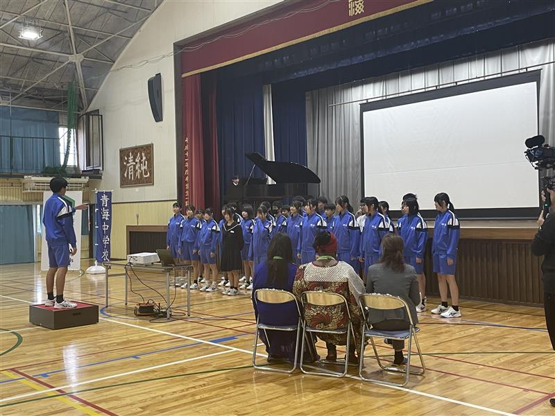 青海中学校の生徒たちは合唱やダンスで温かくJICA留学生を迎え、会場は笑顔と拍手に包まれました。