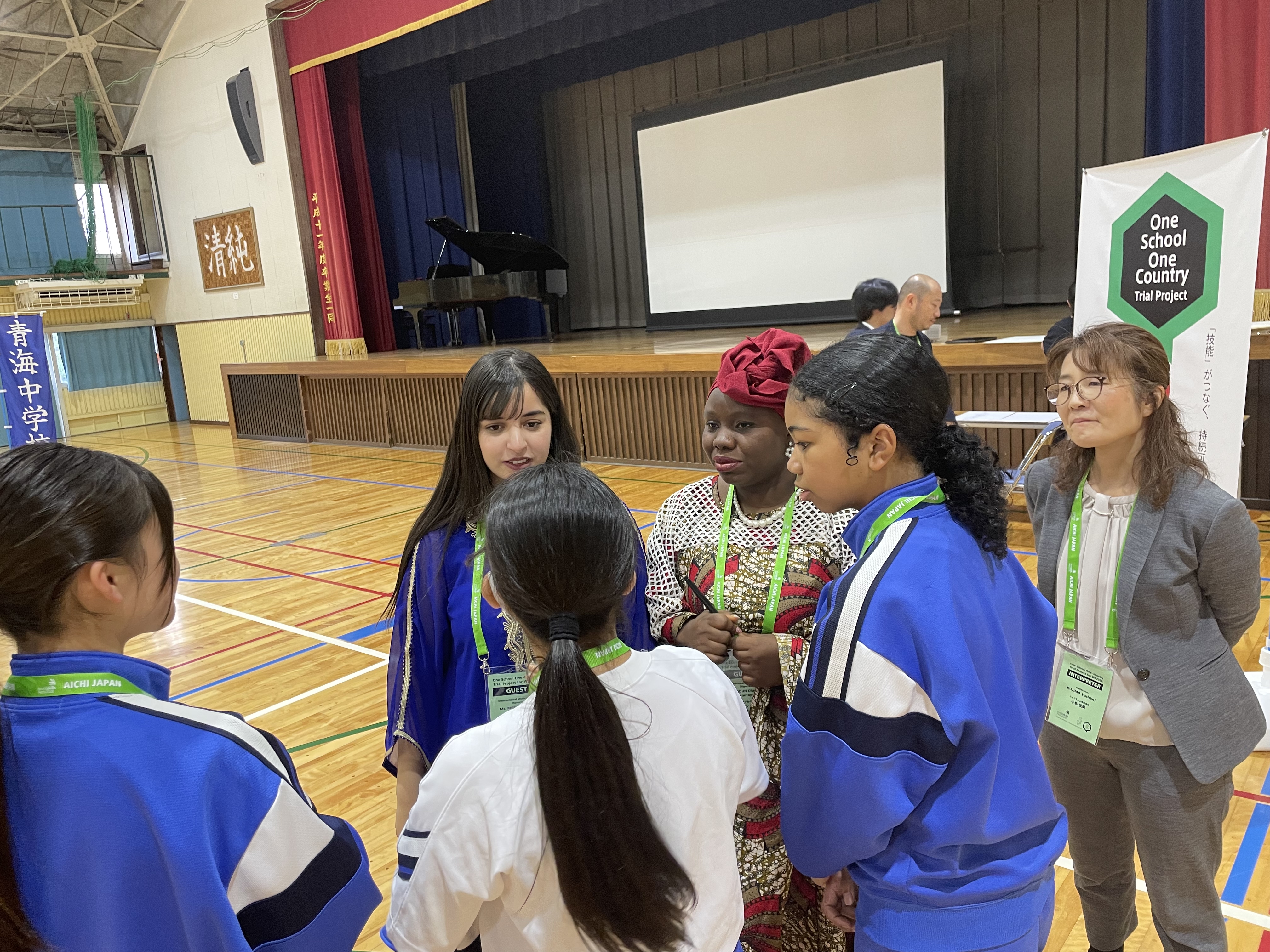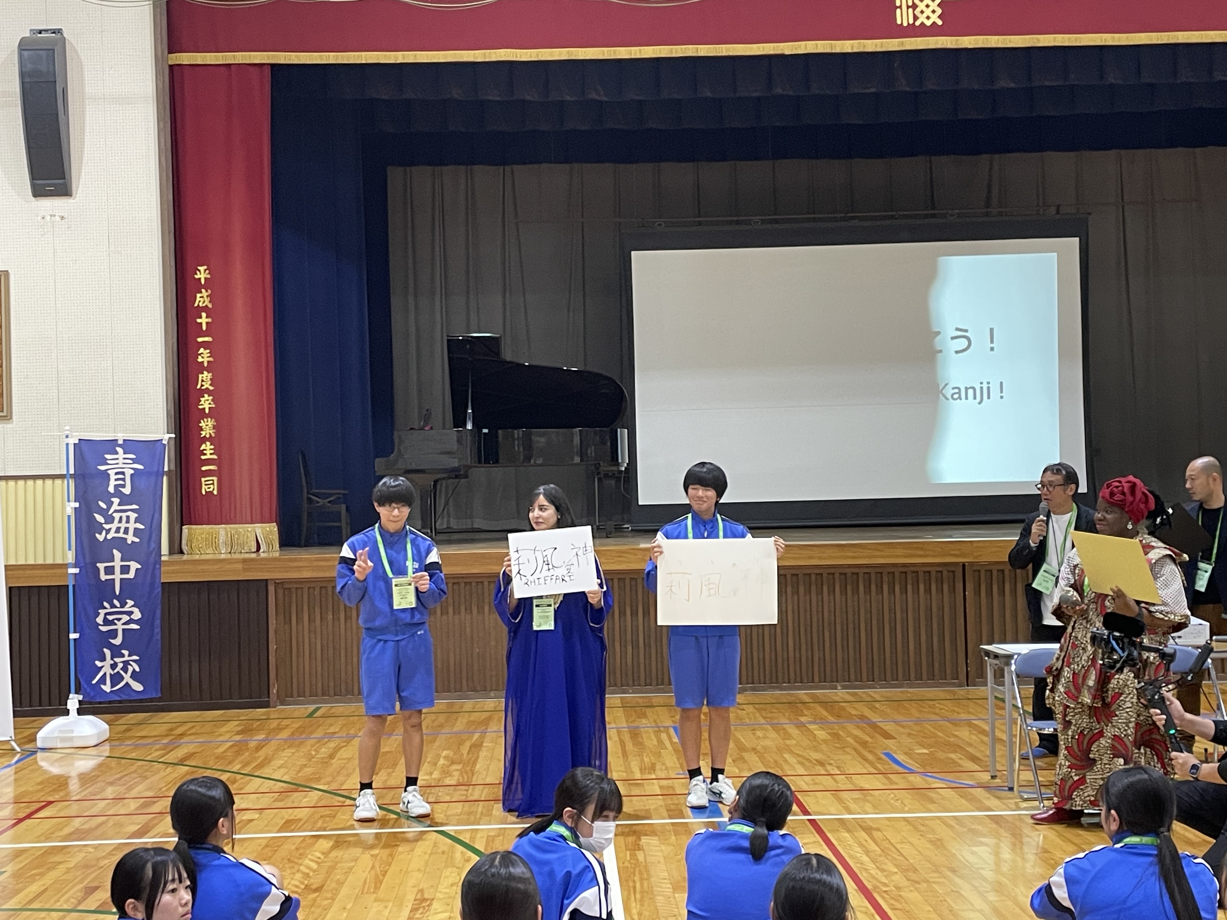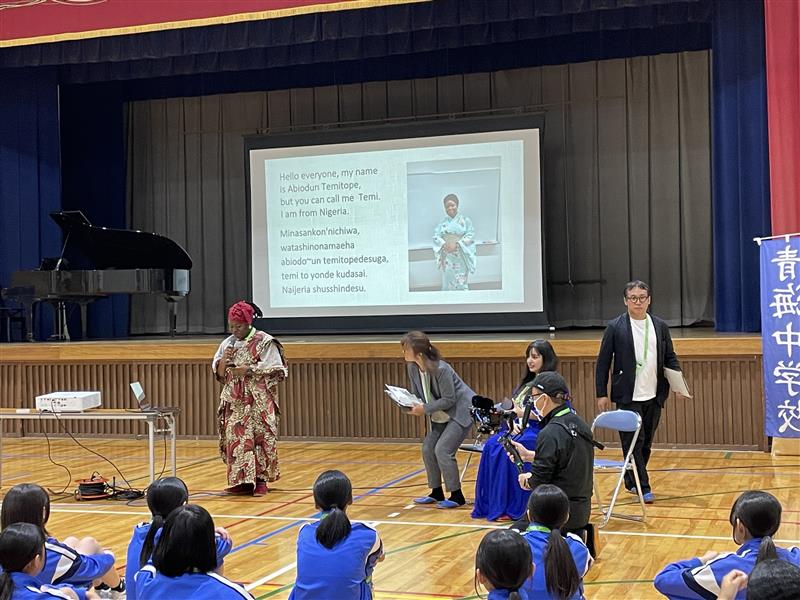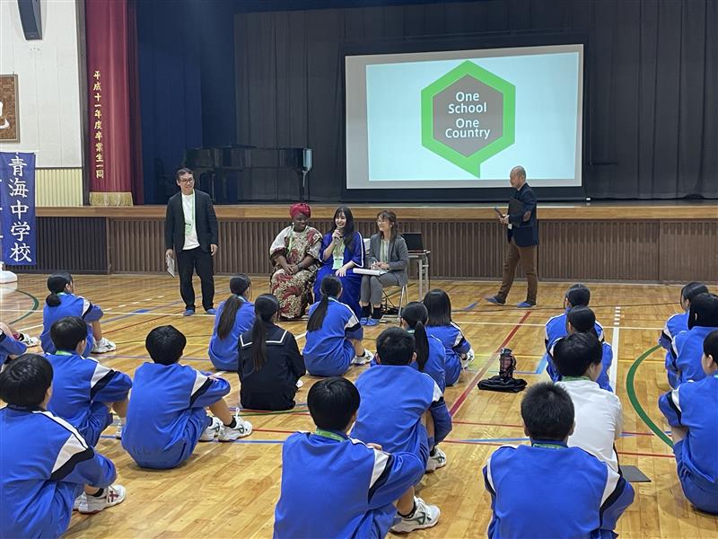 11月13日、中部地域の大学で学ぶJICA留学生(長期研修員)2名(モロッコ、ナイジェリア出身)が、異文化交流の促進を目的として常滑市立青海中学校の2年生約70名と交流しました。本イベントは、2028年に愛知県で開催される技能五輪国際大会「WorldSkills Aichi 2028」に向けた県のモデル事業「一校一国サポート事業」の一環で企画されました。