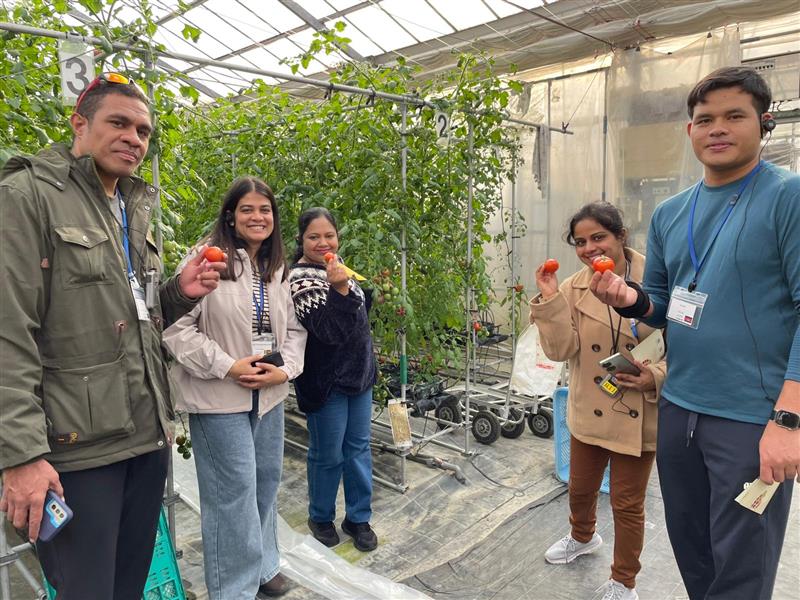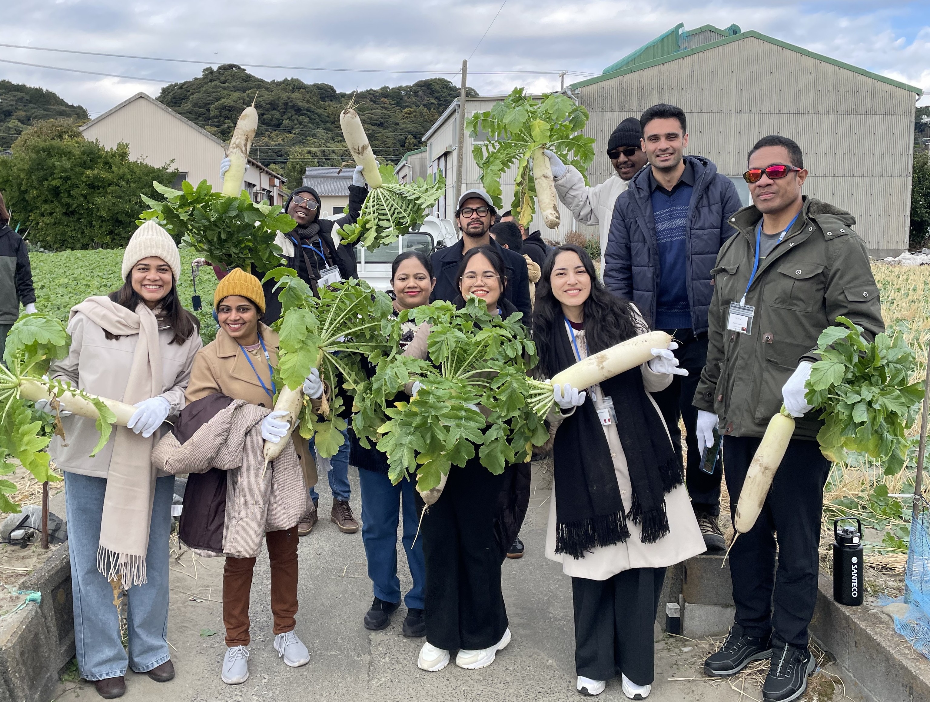 さらに、2日目には大根農家での収穫体験を行いました。地元の方々と食卓を囲みながら、日本と各国の農業や食文化について語り合いました。また、トマト栽培の現場では、IT技術を駆使した高品質生産の仕組みに驚きの声が上がり、日本産トマトの美味しさを堪能しました。