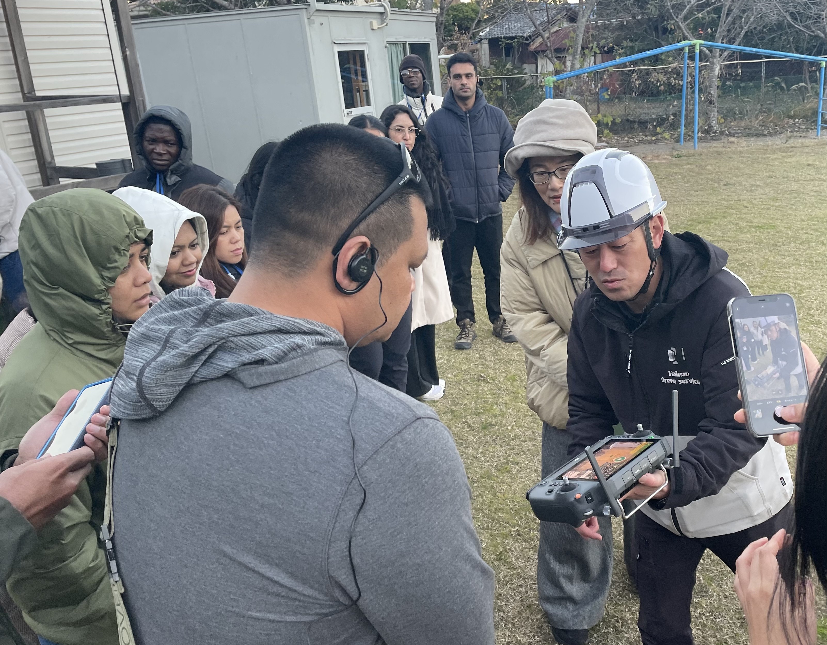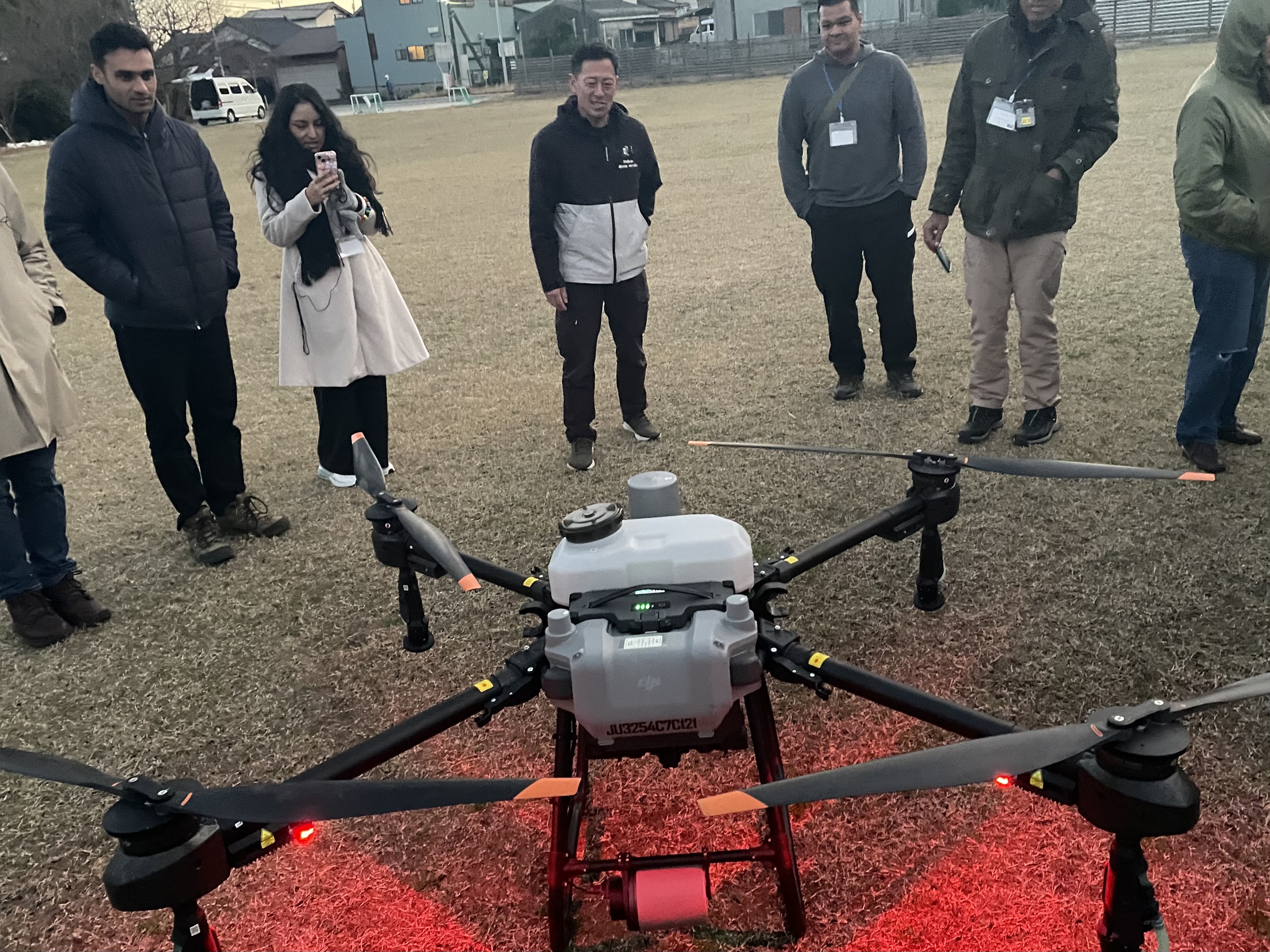 農業用ドローンによる農薬散布の実演では、IT技術が農業の効率化や少子高齢化対策にどのように貢献しているかを実感。研修員からは、自国の農業事情を紹介しながら、ドローンの活用方法や規制について意見交換が行われました。