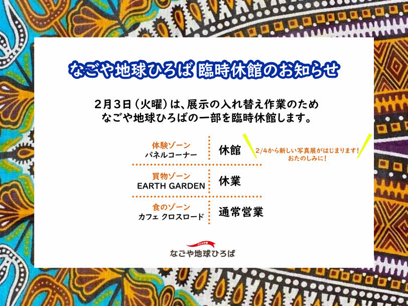 2月3日(火曜)は、展示の入れ替え作業のためなごや地球ひろばの一部を臨時休館します。 ・体験ゾーン/パネルコーナー:休館 ・買物ゾーン EARTH GARDEN:休業 ・食のゾーン カフェ クロスロード:通常営業 2月4日(水曜)から新しい写真展がはじまります! 皆さまのご来館をお待ちしております。