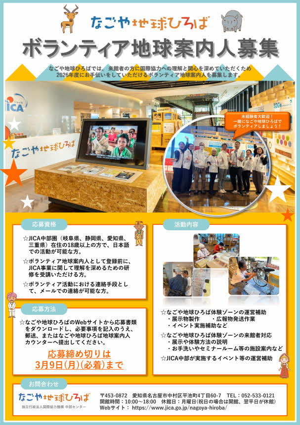 そこで、わたしたち地球案内人と一緒に、来館者の方々の国際協力への理解と関心を深めるお手伝いをしていただくボランティアを募集します。ボランティア活動や国際協力に関心のある方のご応募をお待ちしています!