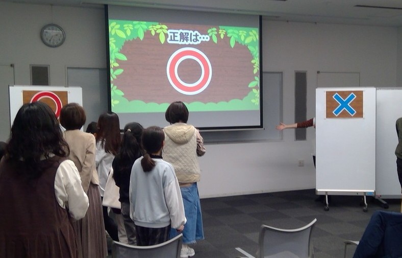 このアクティビティでは、ごかつら池どうぶつパークのスタッフの方から出題されるクイズに参加者の皆さんは、「どっちだろう?」と真剣に悩みながらも、楽しそうに答えていました。