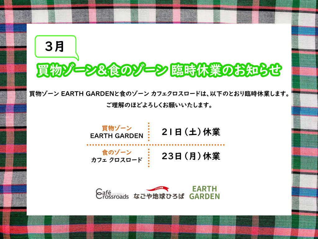 買物ゾーン EARTH GARDENと食のゾーン カフェクロスロードは、以下のとおり臨時休業します。ご理解のほどよろしくお願いいたします。 ●買物ゾーン EARTH GARDEN 21日(土)休業 ●食のゾーン カフェクロスロード 23日(月)休業