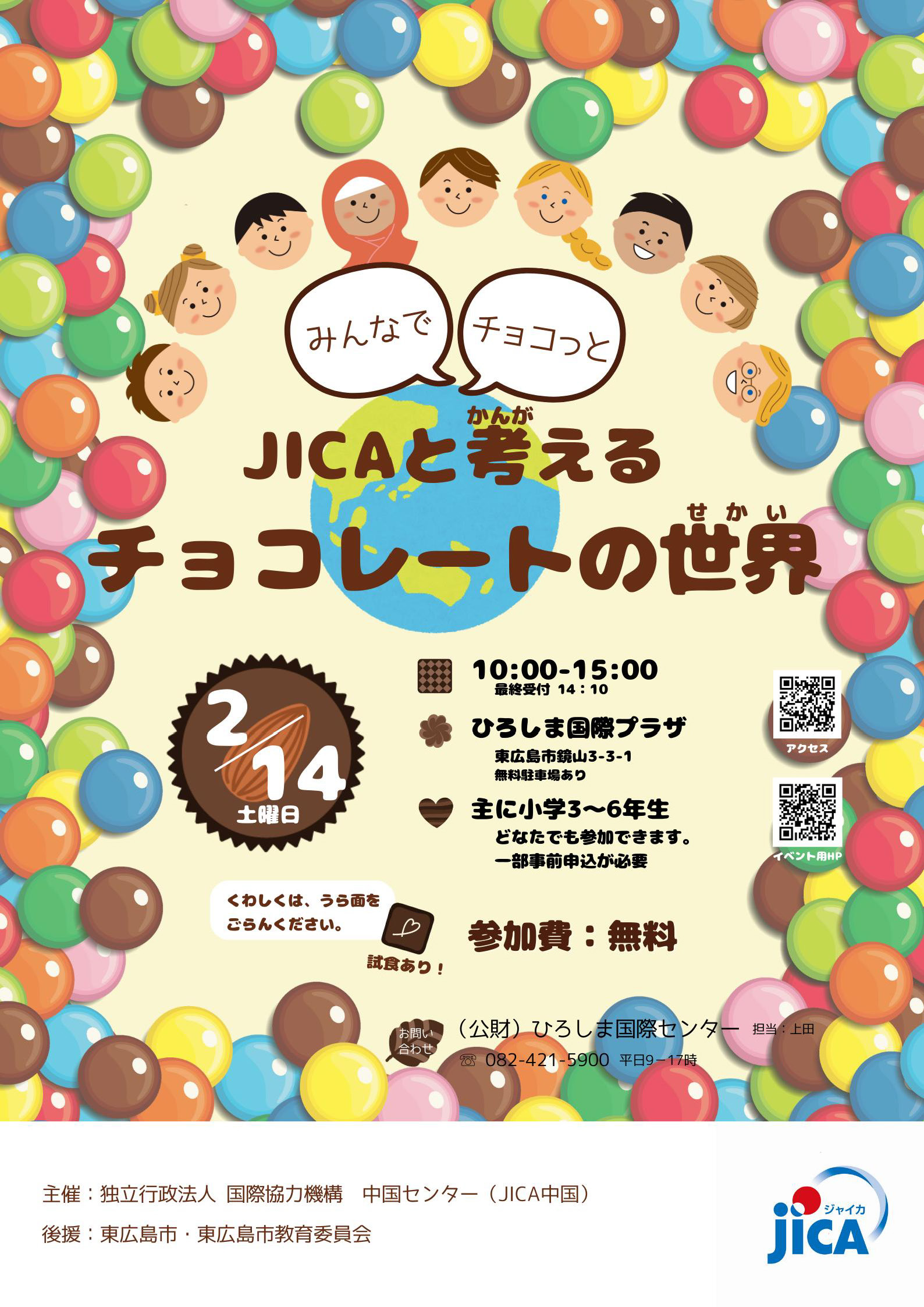 昨年大好評だったチョコレート企画、今年はバレンタインデー当日に実施します。カカオ豆からチョコレート作りをしたり、カカオを作っている国のクイズに挑戦したり、広島大学で勉強中のJICA留学生に、国のことやチョコレート事情を聞いたりしながら、私たちの身近なチョコレートについて、JICAとみなさんと一緒にチョコレートの世界のことを考えてみませんか。