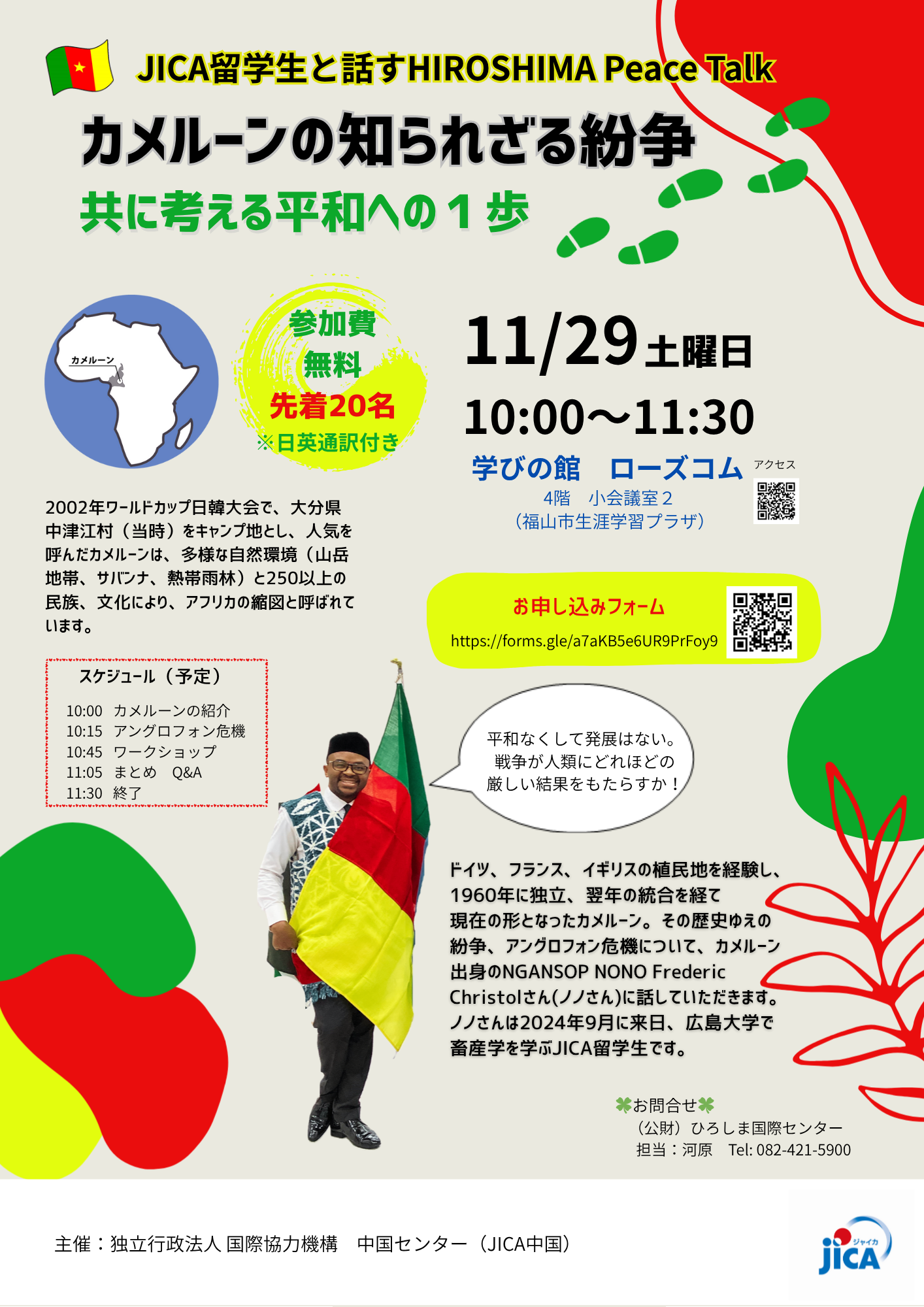2025年度2回目のピーストークは、カメルーン出身のNGANSOP NONO Frederic Christolさん (ノノさん) を講師に迎え、カメルーンの知られざる紛争をテーマに平和について考えます。被爆80年の今年、福山市にある学びの館ローズコムで初開催です。日英通訳付です。ぜひお気軽にお越しください。