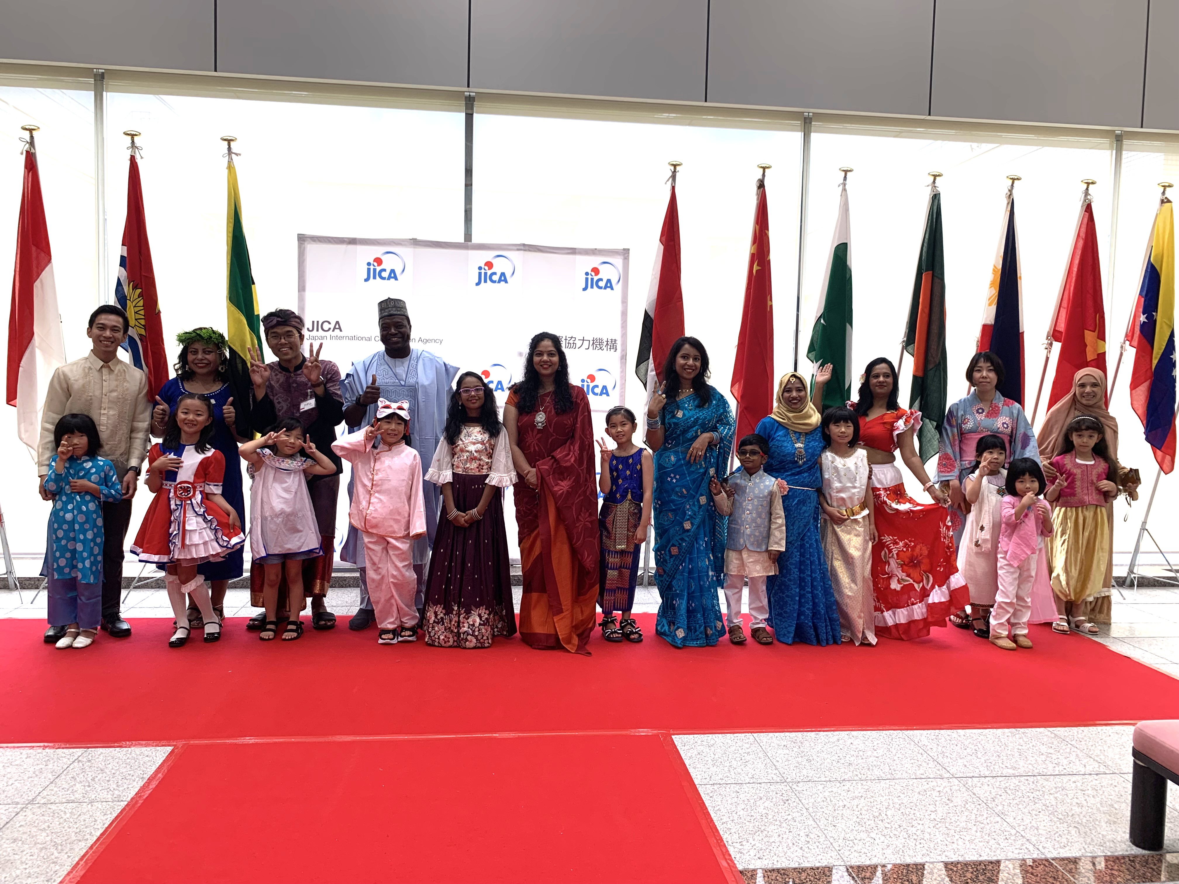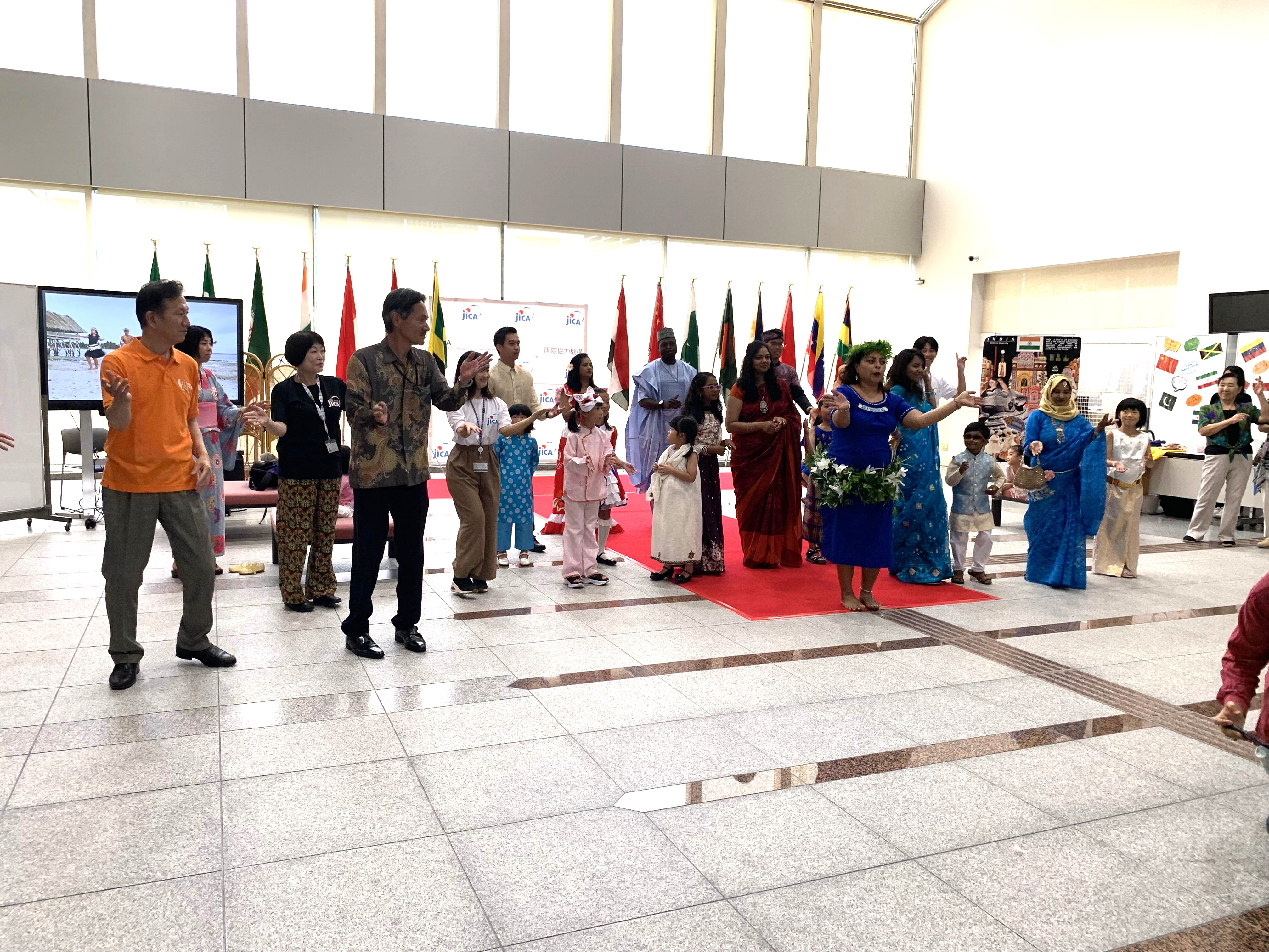 書道パフォーマンスに続いて世界の民族衣装を紹介するファッションショーも行いました。JICAの研修員(※)が日本のこども達と一緒に登場したり、外国籍の親子が歩いたりと様々な衣装を披露しました。訪れた人たちは、司会者が説明する衣装の特徴を聞きながら、それぞれの国の衣装を着てランウェイを歩く国際色豊かな雰囲気を楽しんでいる様子でし最後には、キリバスのロリーヌさんが大洋州の踊りを紹介してくれ、会場の皆で賑やかに踊る等、会場が一丸となって楽しく盛り上がり、とても賑やかな時間となりました。