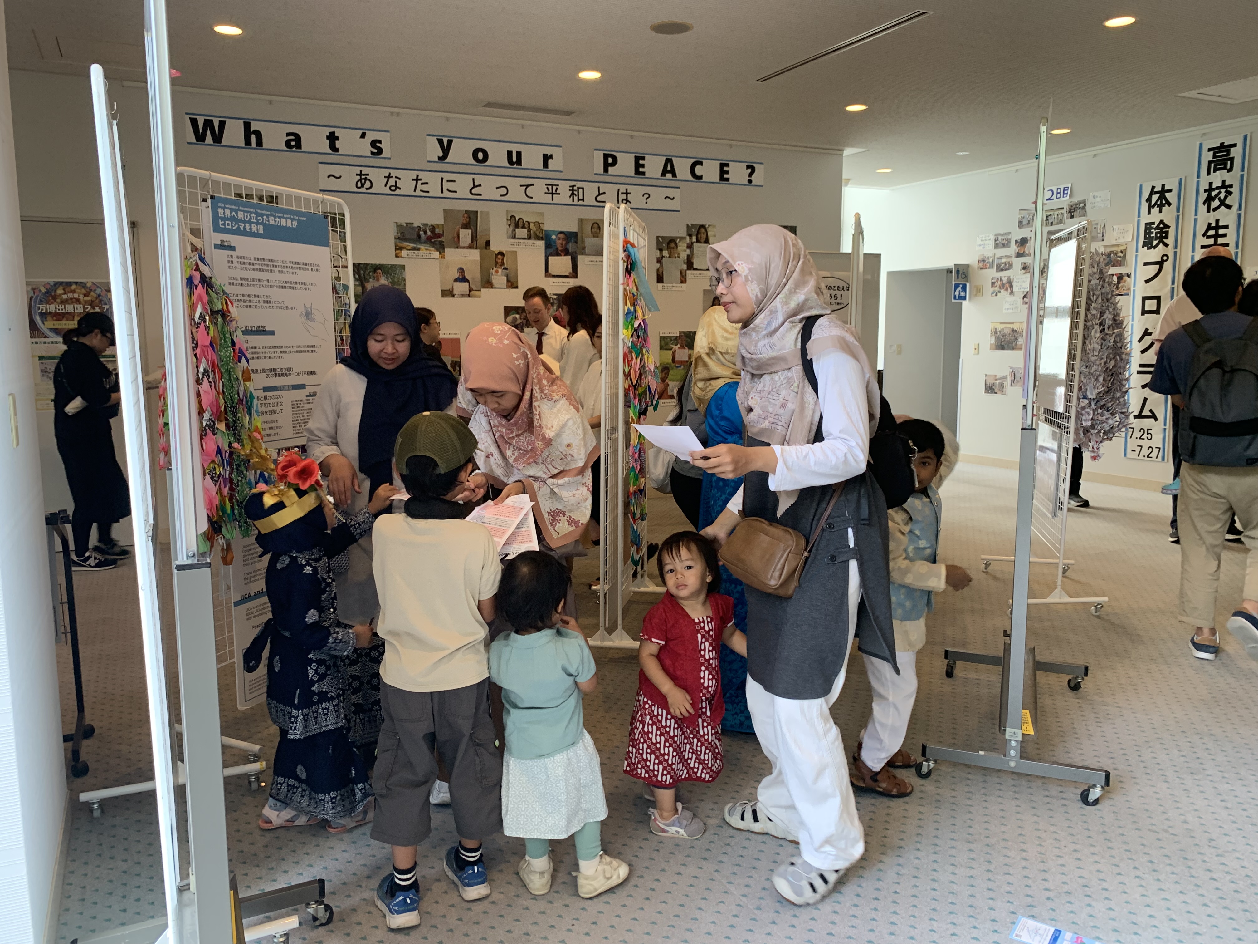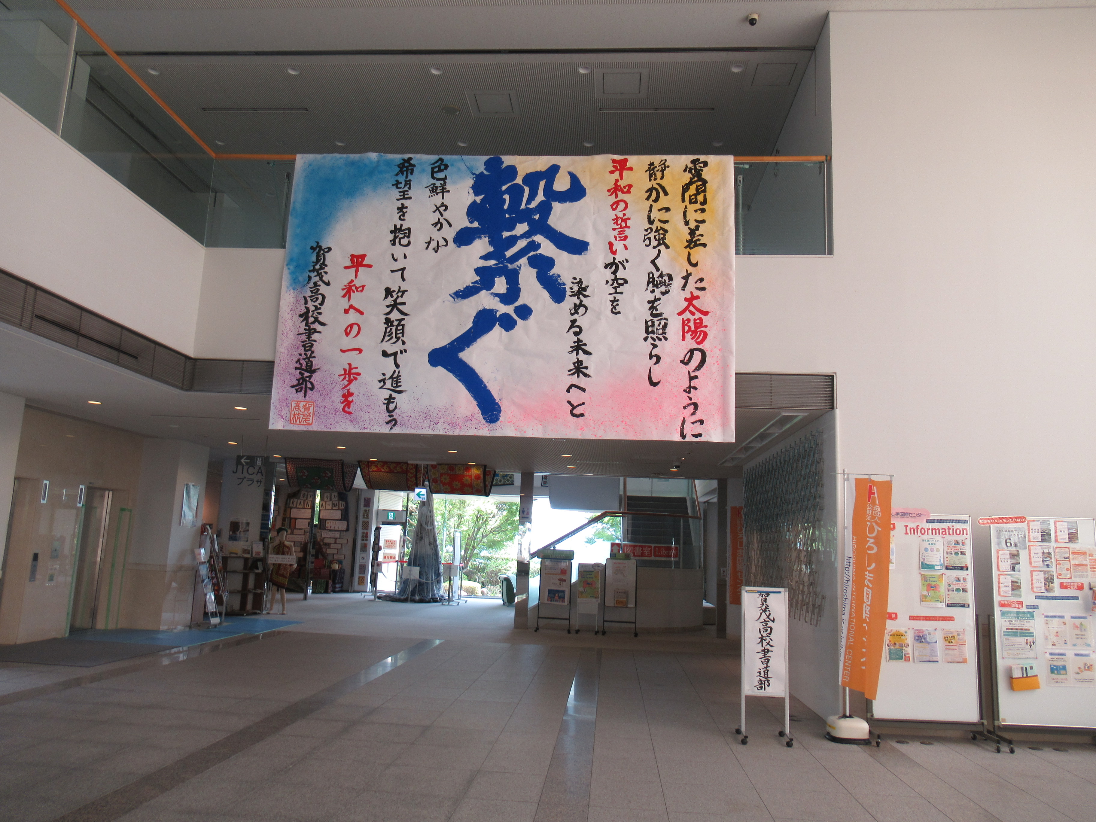JICA中国とひろしま国際センターの入るひろしま国際プラザ(HIP)は、東広島市鏡山のサイエンスパーク内にあり、サイエンスパークにある団体は毎年夏の「サイエンスパーク施設公開」イベントで一般の方々向けに施設を開放しています。今年は被爆80年であることから、HIPの施設公開は「平和」をテーマに開催しました。オープニングイベントとして、広島県立賀茂高等学校書道部の書道パフォーマンスで華々しくスタート、作品のテーマはもちろん平和。音楽と共に4人の部員がそれぞれの担当に分かれて、およそ3メートル×5メートルの大きな紙に平和への思いを書き綴った10分間で、あっという間にとても素晴らしい作品が出来上がりました。当日は、多くの人が見守るなか床に置いて仕上げましたが、現在では、HIPのロビー二階より吊るされ、訪れる人の心をはっとさせる大きな存在となっています。HIPにお越しのみなさまに見ていただきたく、年内は展示しています。