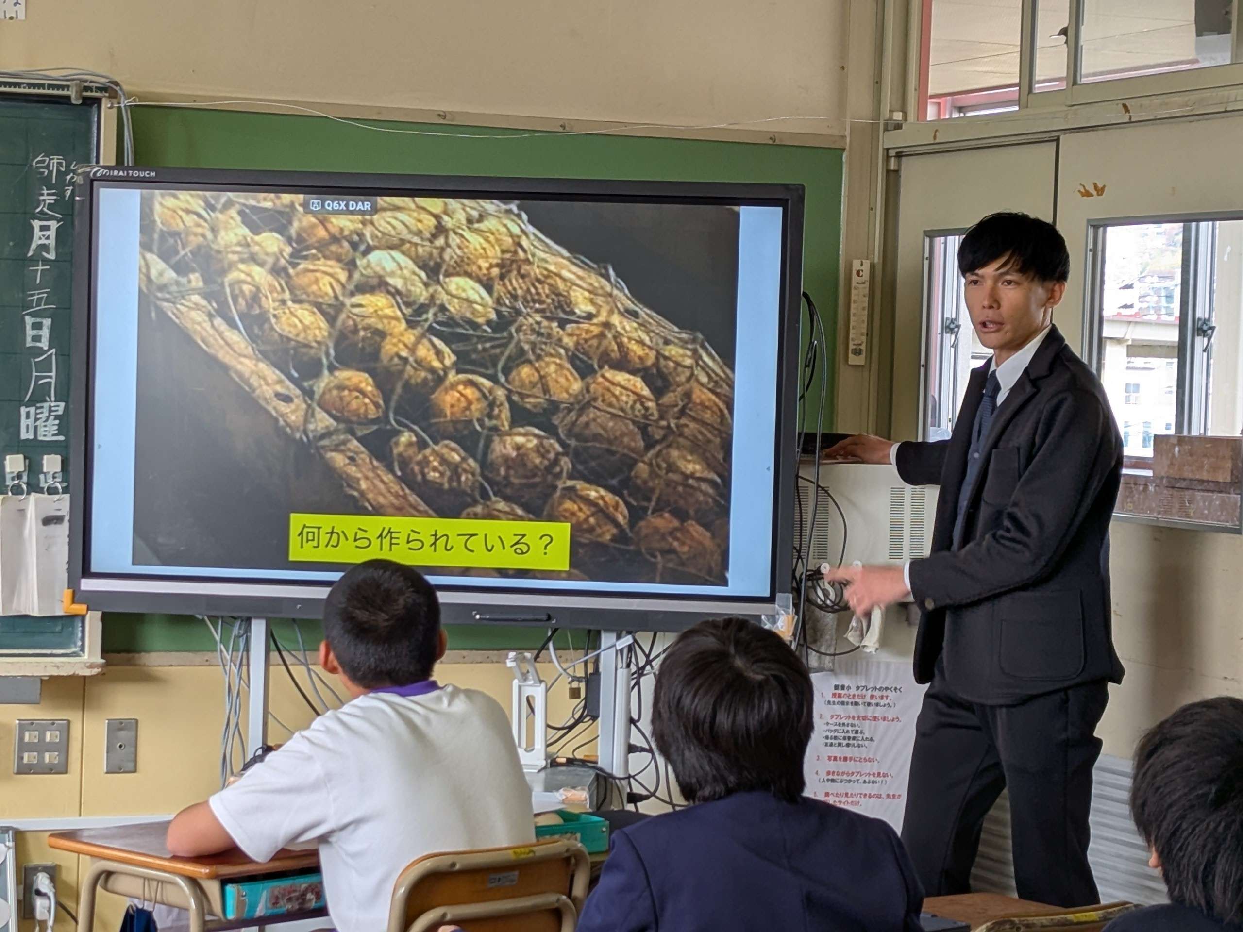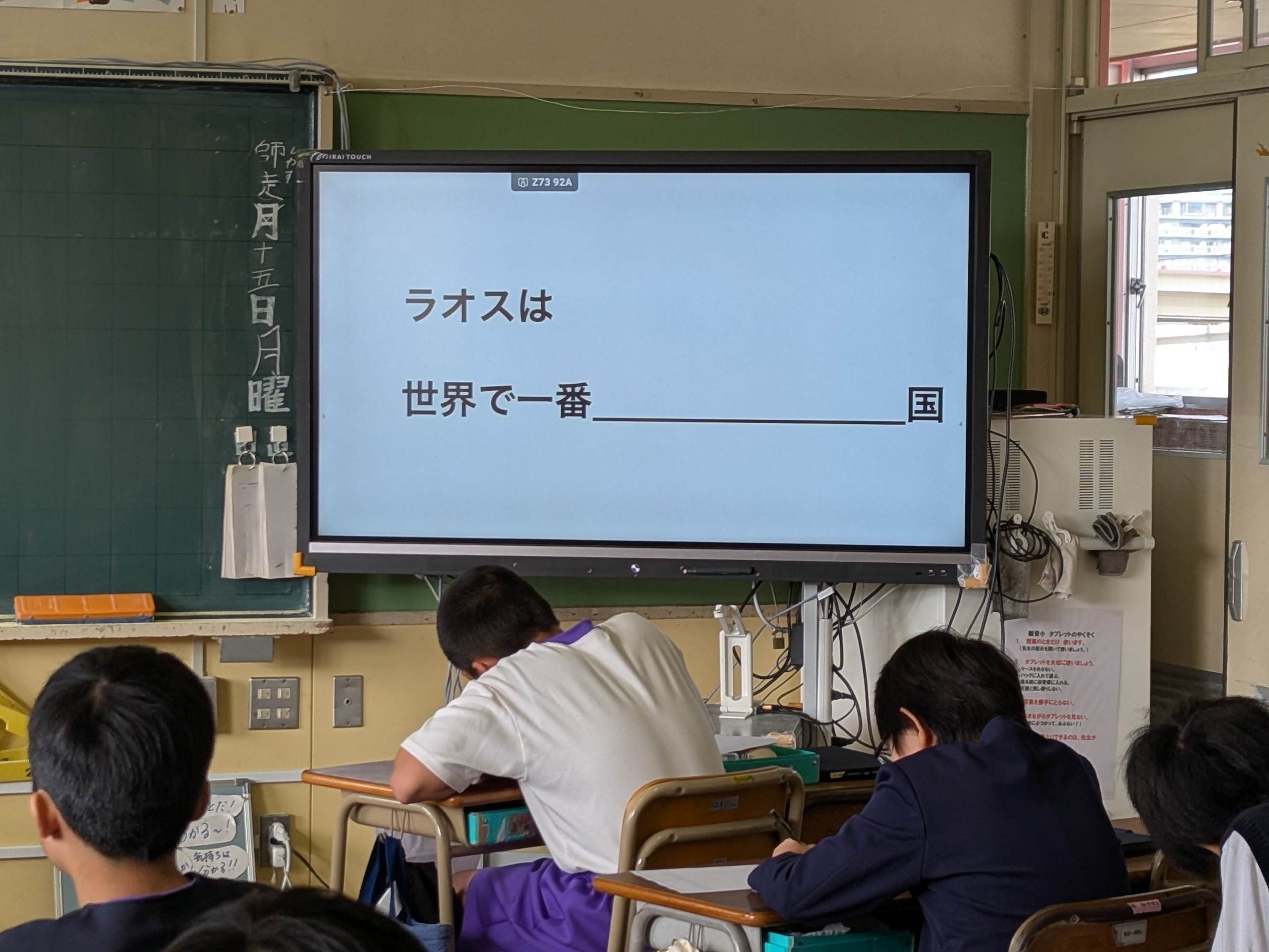 2025年12月15日(月)、広島市立観音小学校5年2組の総合的な学習の時間の最初に、川崎悠先生は一枚のスライドを子どもたちに見せました。「『ラオスは世界で一番( )な国』。さあ、( )には何が入るだろう?」