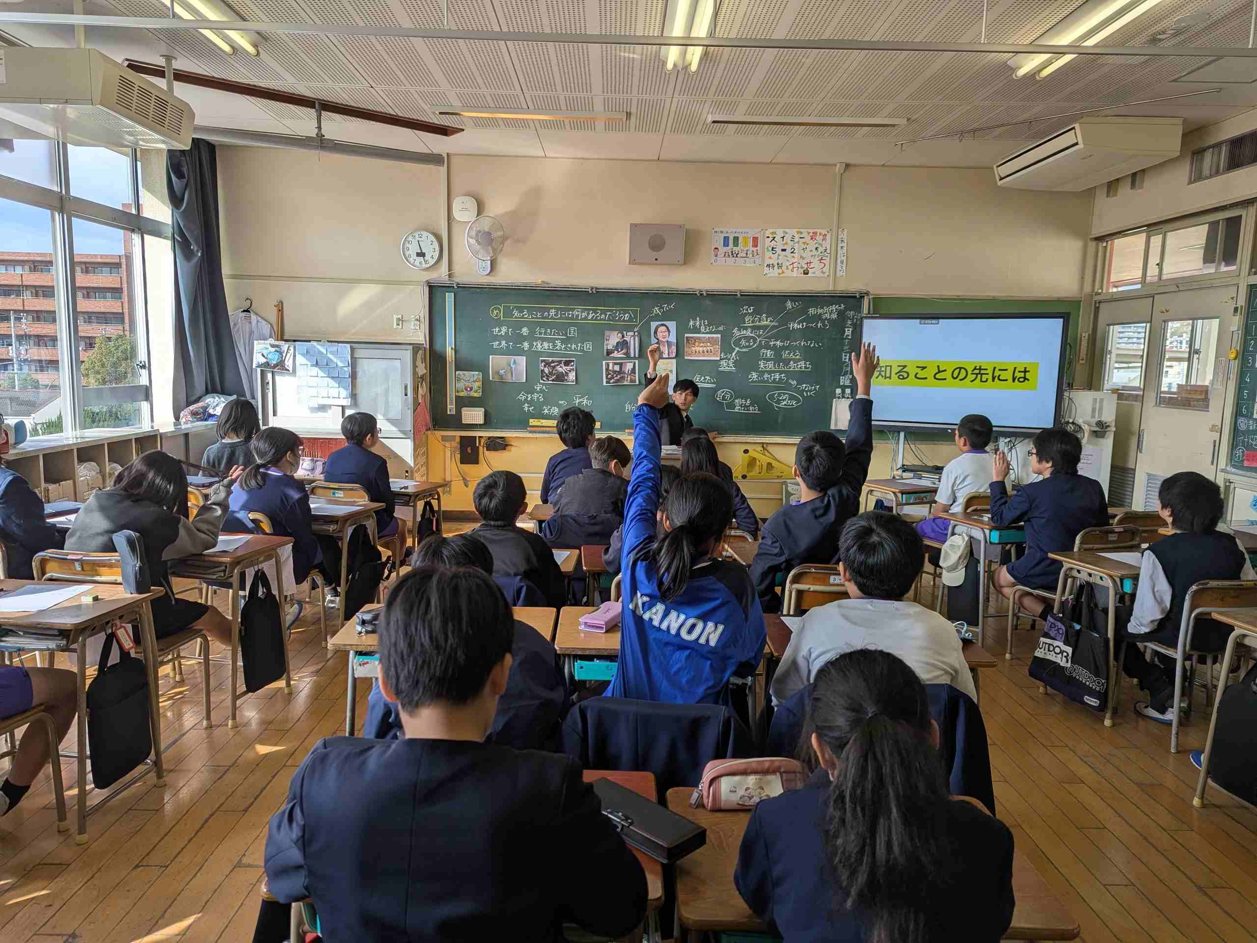 大人にとっても難しい質問に、児童は頭を悩ませながらも「知るだけでは平和にはならないね」、「いや、知ることで平和は作れると思う。相手の国のことを知ることで、相手の気持ちが理解できる。そうすれば戦争にならないんじゃないかな」など、たくさんの意見が上がりました。そして「知ることで、自分も頑張ろうという強い気持ちにつなげていける」という感想が上がると、続けて多くの児童から「自分たちが知ったことを他の人に伝えるのはどうかな?」、「他の学年とか、家族にも伝えられる!」と、自分自身ができること、そして5年2組のみんなでできそうなアイデアが次々と飛び出してきました。