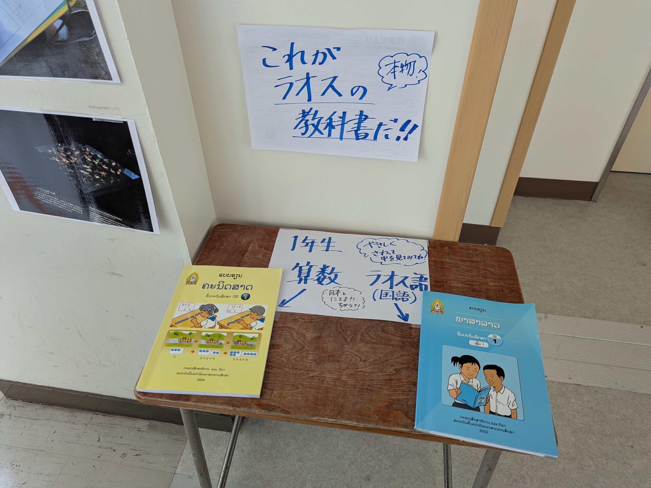 今夏、JICA中国・四国 教師海外研修に参加し、ラオス人民民主共和国を訪問した川崎先生は帰国後、廊下に現地で入手したラオス語の教科書を並べたり、現地の食事や町の風景といった自身が撮影した写真を掲示したりと、校内の児童がラオスという国に触れることのできる工夫をしてきました。そして5年生の子どもたちには、ラオスと日本の違うところや同じところを見つける授業を行い、子どもたちから「もっとラオスのことを知りたい!」という声を引き出していました。