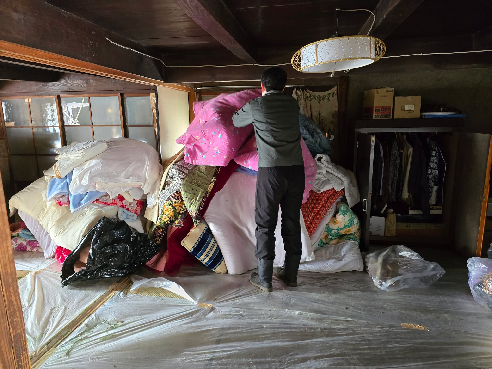 家の中を片付けていく中、押し入れから様々なものが次々と出てきました。運び出していく過程で、天井まで届くほどに積みあがった大量の布団には、白須さんも住宅プロジェクトチームのメンバーも驚きの表情を見せていました。
