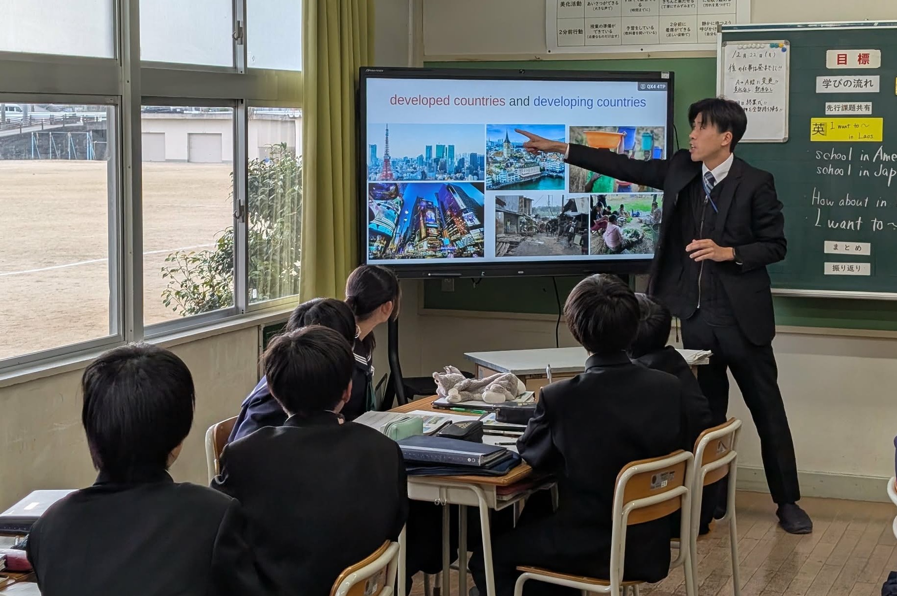 この経験をきっかけに、「生徒にも世界に目を向けてほしい」「文化の違いや多様性について考えてほしい」「開発途上国について学び、自分に何ができるか考えるきっかけにしてほしい」という思いを持ち、授業では英語を実際に使い、話してみることを大切にする姿勢を意識しました。この日の授業テーマは「他国の学校生活を知り、良さや課題に気づき、自分たちにできることを考えてクラスで共有する」でした。