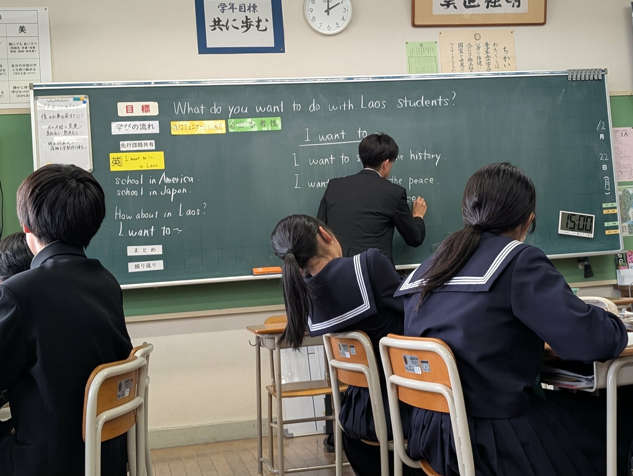 2025年12月17日(月)、JICA中国・四国の教師海外研修に参加し夏にラオス人民民主共和国を訪問した里庄町立里庄中学校の佐藤文哉先生が、1年生の英語の授業で「ラオスでの学びを生かした授業実践」を行いました。ラオスで使用されている言語はラオ語と呼ばれる言葉ですが、佐藤先生はラオスでのホームステイを経験した際、村に住む少女と英語で簡単なあいさつや名前を伝え合うことでコミュニケーションをとることができた経験から、第二言語として英語を学ぶ有用性を強く実感したといいます。