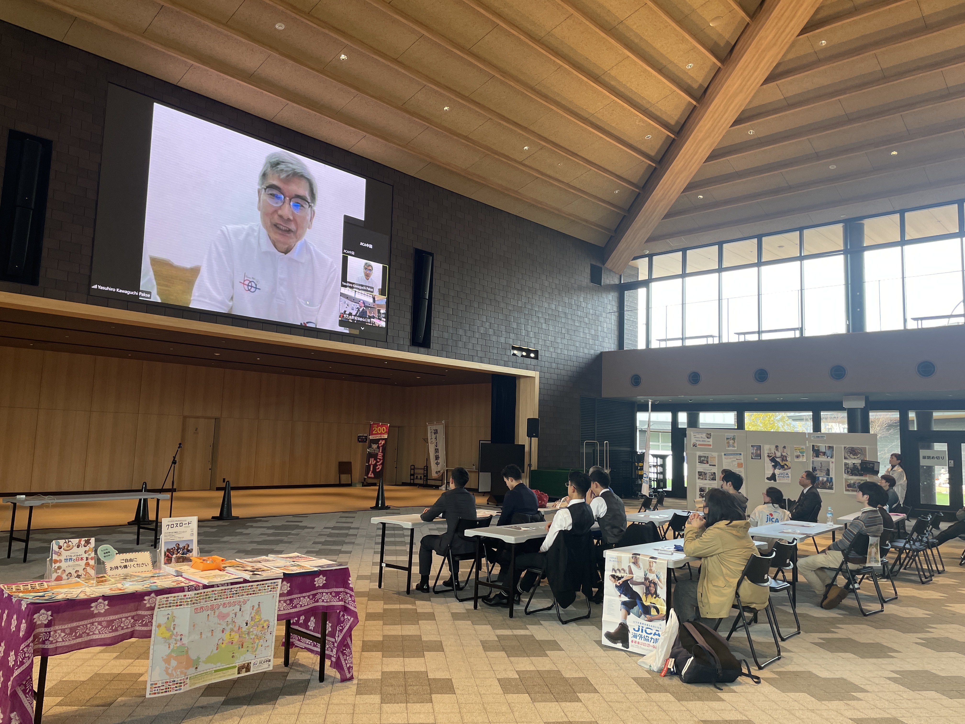 JICA海外協力隊としてラオスに派遣中の川口隊員との生中継の様子(山口会場)