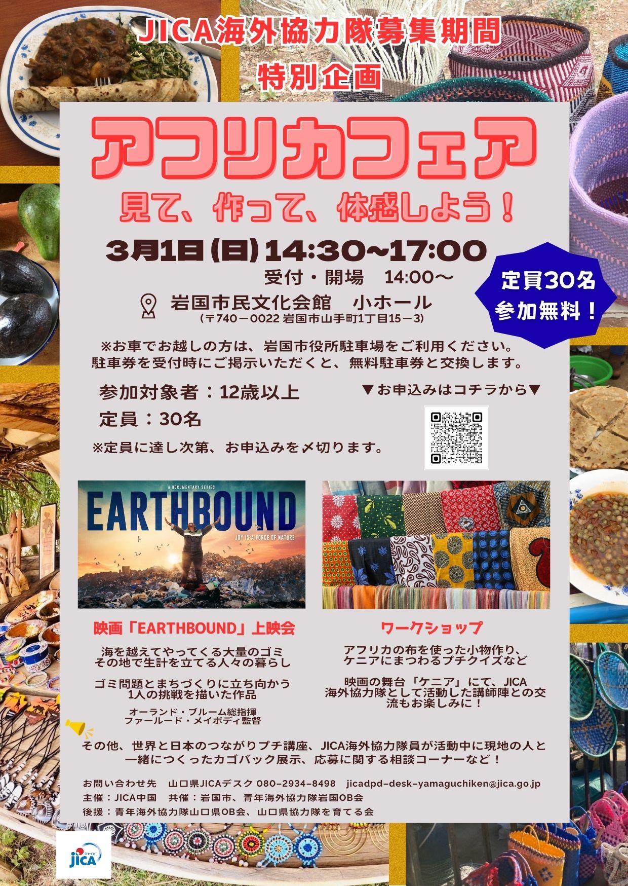 3月1日(日)、岩国市民文化会館では「アフリカフェア~見て、作って、体感しよう!映画「EARTHBOUND」無料上映会×ワークショップ~」を開催しました。第一部では、映画を通して世界で起きている社会課題と現地の人々の生活を知ってもらい、世界と日本の繋がりと、その中で国際協力はなぜ必要なのか、私たち一人ひとりにできる国際協力とは何なのか、国際協力クイズや国際理解教育実践資料集を使ったカードゲームを行いながら参加者全員で考えました。そして第二部では、映画「EARTHBOUND」の舞台となったアフリカのケニアにて、JICA海外協力隊のコミュニティ開発隊員として活動された協力隊経験者の体験談をベースにアフリカビンゴクイズを行い、ビンゴの正解数に応じて、アフリカ布を使ったマグネットづくりをしました。ビンゴのクイズに答えていくことでケニアの文化や協力隊の活動理解が深まる仕掛けになっており、会場では積極的にクイズに取組む参加者の姿が見られました。会場には幅広い年齢層の方が来場され、楽しみながら、異文化理解とJICAの活動を知ってもらうプログラムとなりました。JICA海外協力隊の応募を検討されている方には、応募相談ブースを設置し、JICAスタッフが職種や制度の説明を個別に案内しました。JICAボランティア事業は2025年に60周年を迎え、岩国市では、岩国市と青年海外協力隊岩国OB会共催の元、50年以上JICA海外協力隊の募集説明会を行ってきています。