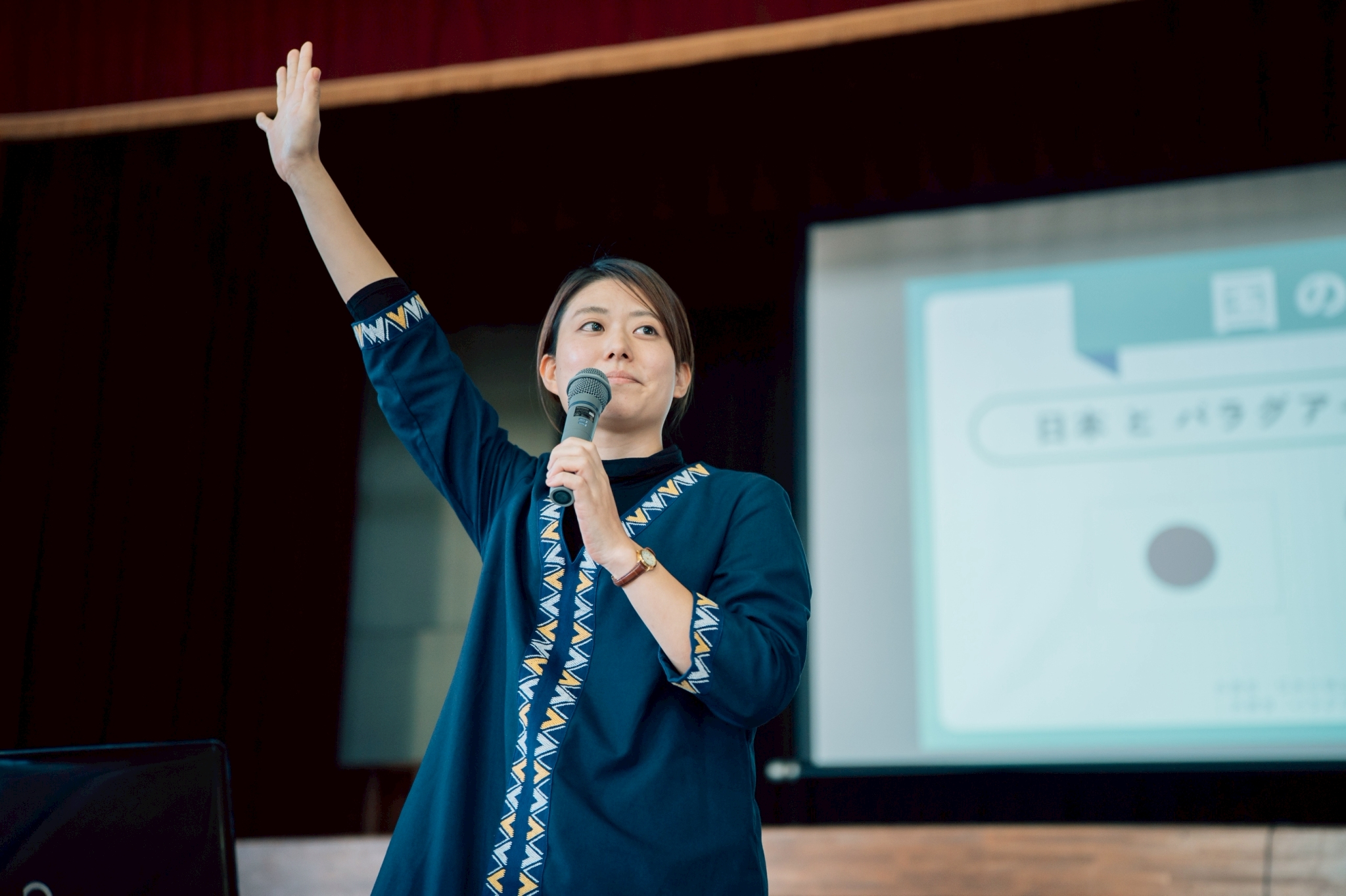 “南米のおへそ”と言われ、南米大陸の真ん中に位置するパラグアイ。只野さんはクイズを交えながらパラグアイの紹介をしていきます。現地の方言であるグアラニー語を初めて聞く生徒のみなさんは、聞いたことのない言葉に驚いた様子。パラグアイの食べ物の写真や動画を紹介したときは、会場から「美味しそう」とい声が聞こえてきました。