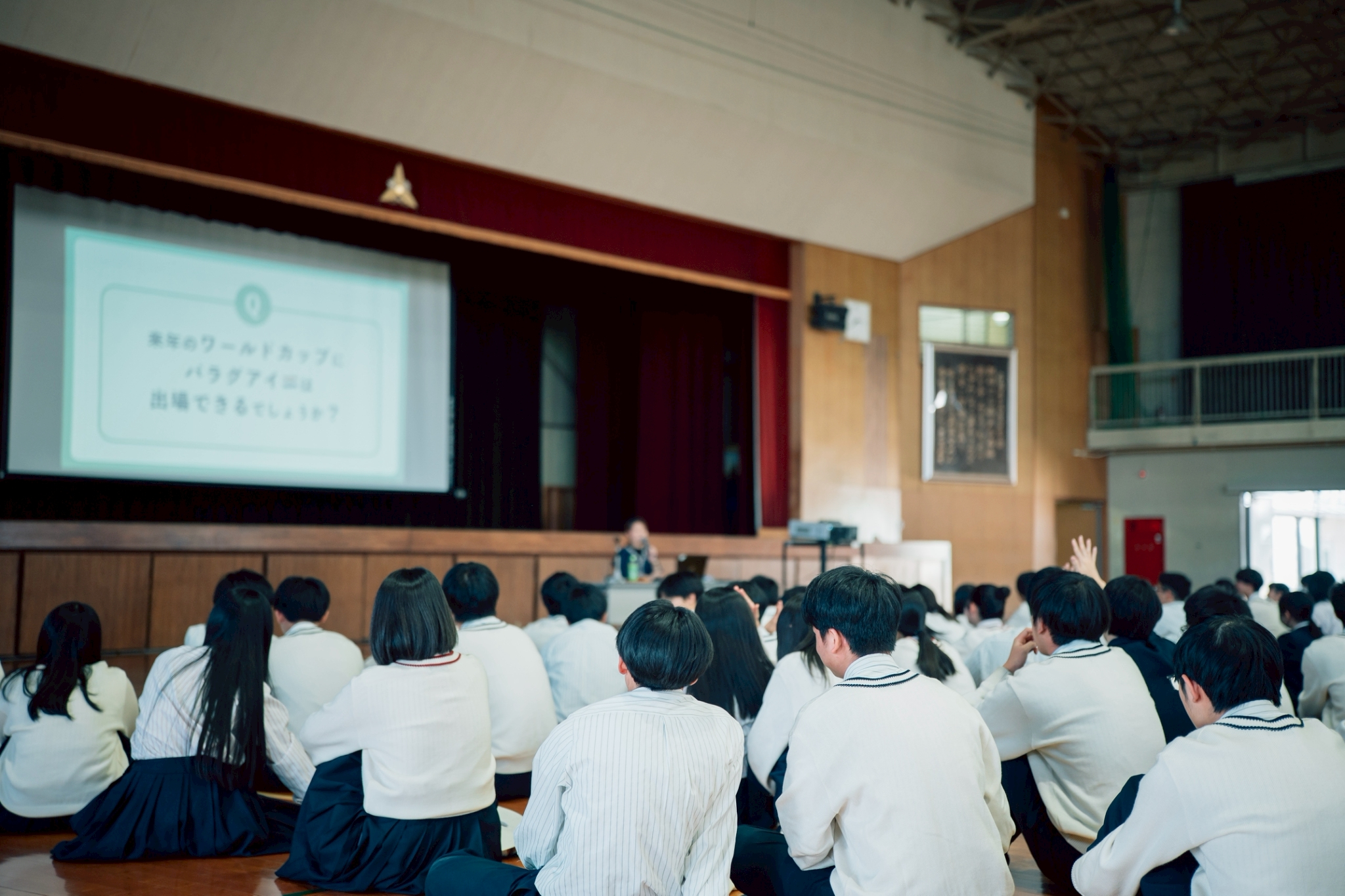 2025年10月23日、広島県立井口高等学校の広い体育館に集合した高校3年生310名のみなさん。今日は、南米パラグアイの日系人コミュニティで、青少年活動の隊員として活動された只野杏奈さんからJICA海外協力隊の体験談をお聞きする日です。