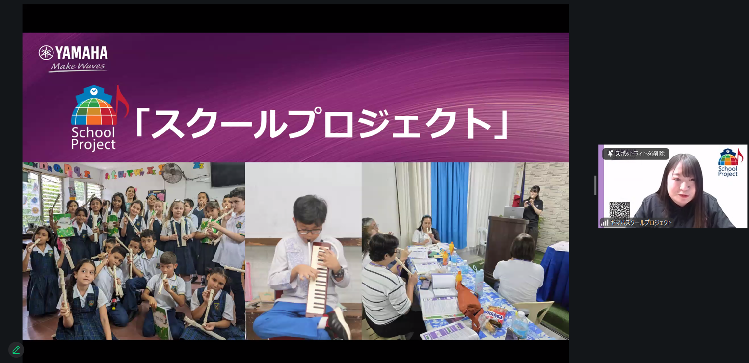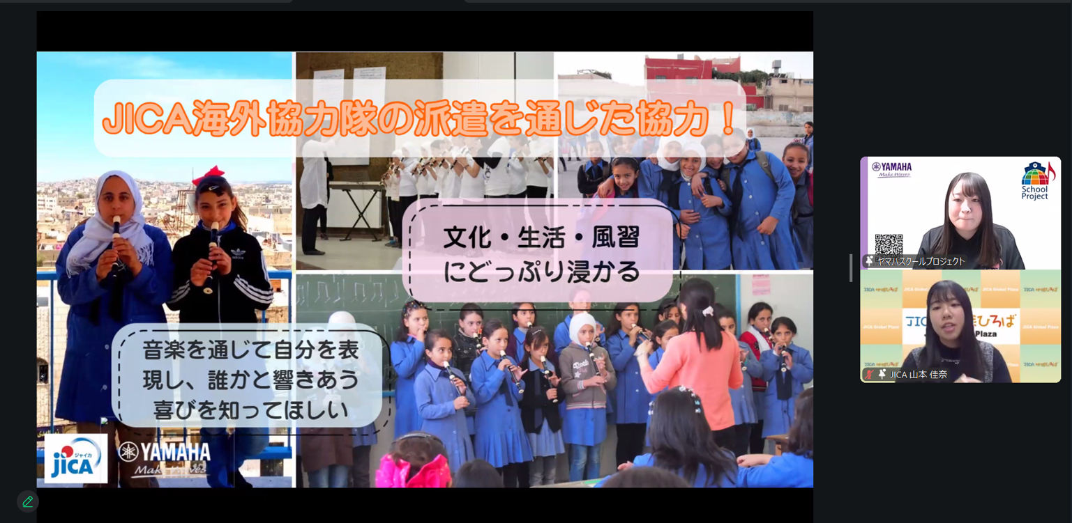 新興国の公教育に音楽の授業を届けるため、ヤマハ株式会社とJICAが協働して進める「スクールプロジェクト」を紹介するオンラインイベントを開催しました。スクールプロジェクトでは2015年以来、世界10か国以上へ新しい音楽の授業の構築支援が展開しています。本イベントでは、フィリピン、エジプト、インド、コロンビア、ベトナム、マレーシアなどで、実際にヤマハが各国の文化や教育制度に寄り添いながら開発した支援の様子が紹介されました。現地で支援が始まるまでの流れや、児童が自由に自己表現できる音楽教材、音楽経験の少ない教員でも安心して指導できるような教員研修の工夫など、持続的な仕組みづくりについての解説がありました。さらに、日本とエジプトの小学生のオンラインでの交流は「音楽が言語を超える瞬間を形にしたようなプロジェクト」として紹介され、「主体性も協調性も育める音楽教育」の価値が伝えられました。ヤマハの専門性とJICAのネットワークの「連携」による好事例を知るイベントとなりました。参加者からは、「海外でのヤマハの音楽教育の取り組みやJICAの関わりがわかった」「子どもの非認知能力を高めるために、途上国で音楽教育の普及をしていることを知ることができた」「日本企業が音楽と関連づけて、途上国でどのような支援活動をされているかを知ることができた」などの感想をいただきました。