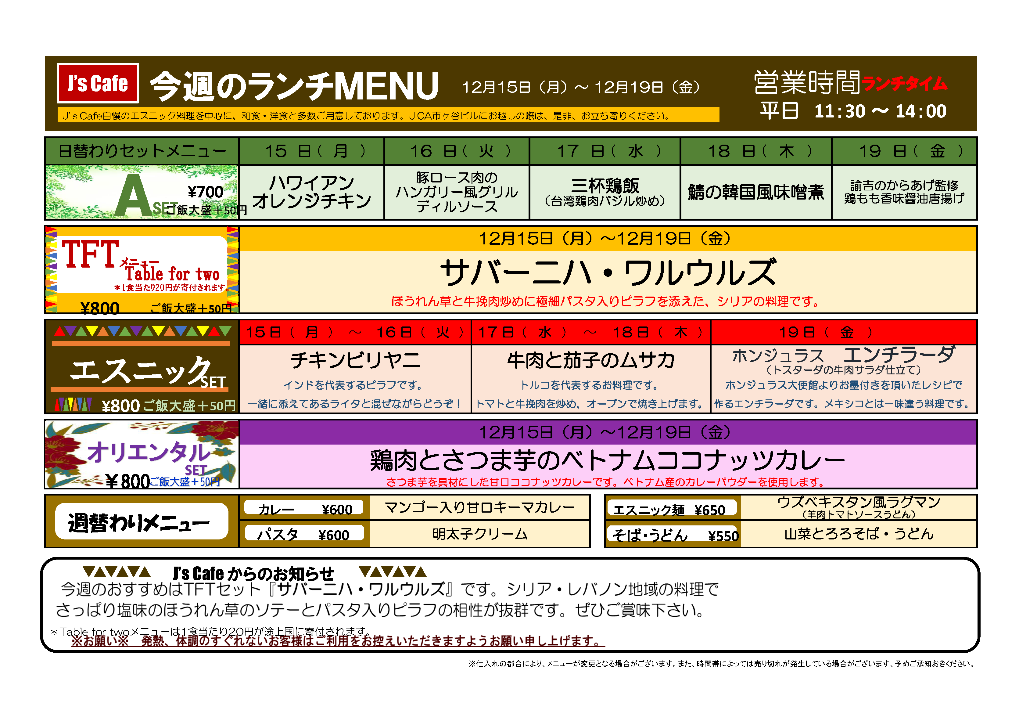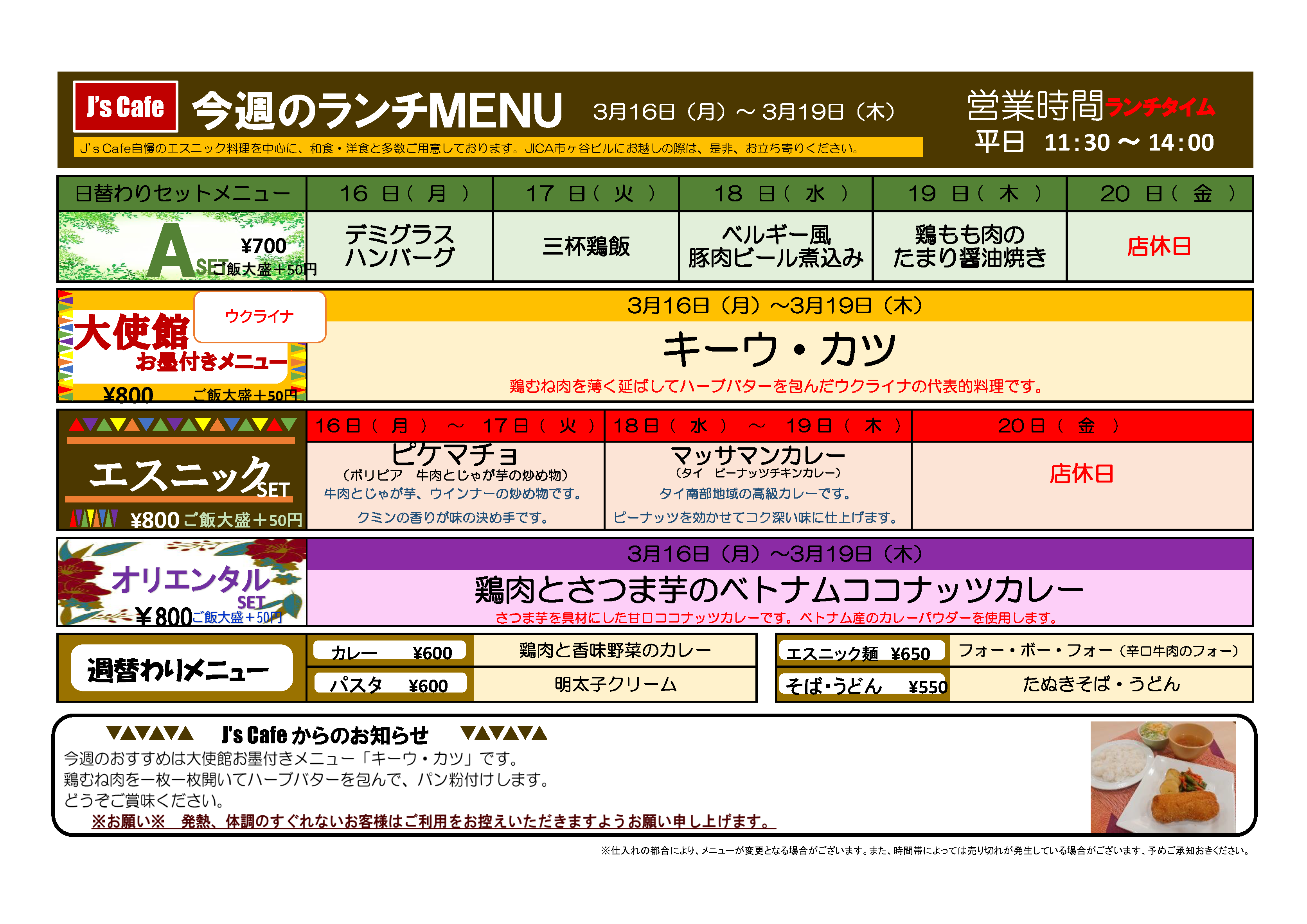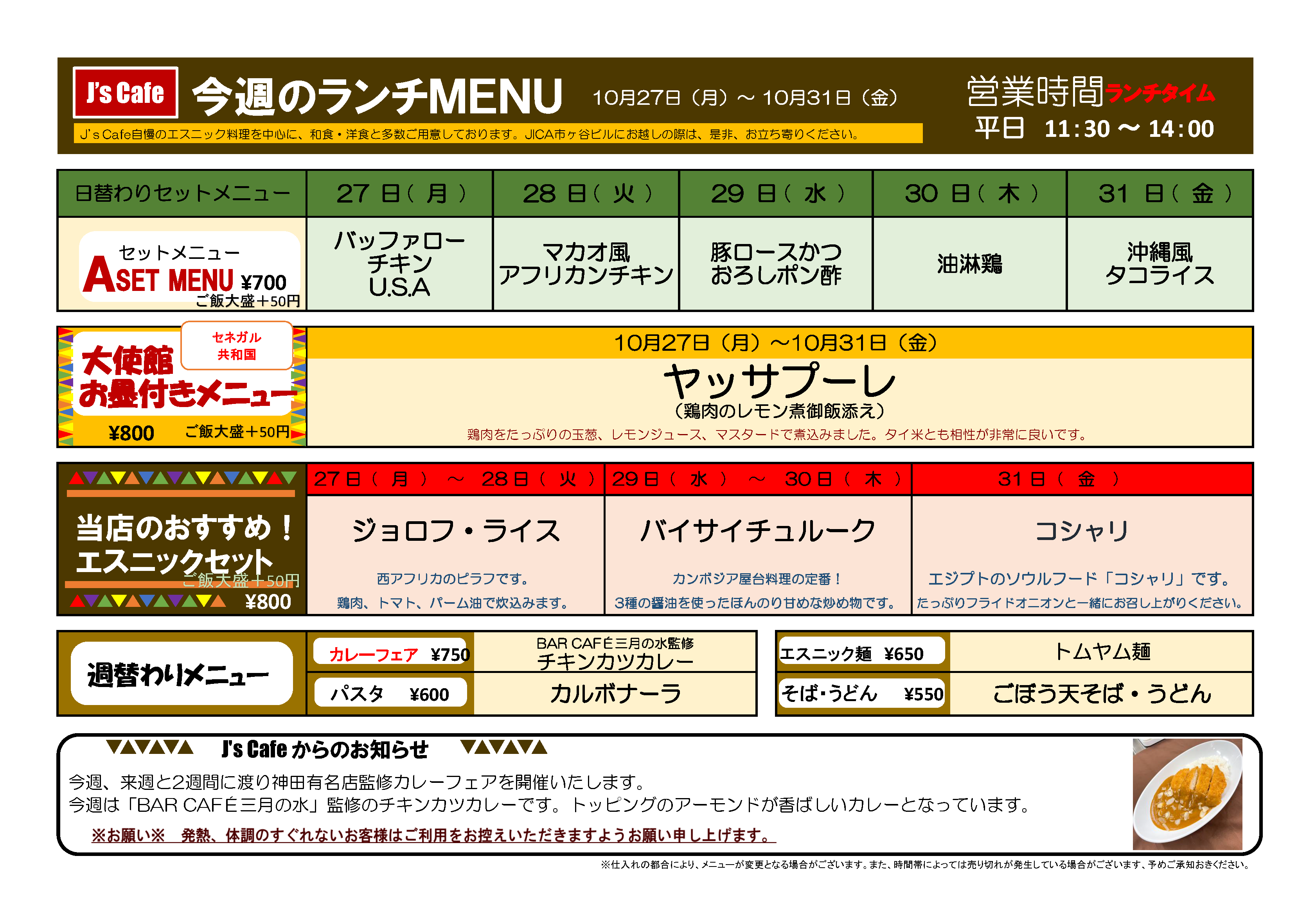 ※その月により、「大使館お墨付きメニュー」または「TFTセット」のいずれかをご提供しています。詳細は「今週のメニュー表」をご覧ください。