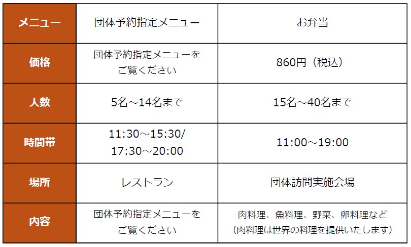 提供場所:レストラン(最大16名まで)または団体訪問実施会場