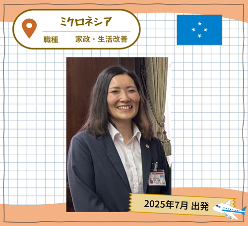 ポンペイ州政府教育局幼児教育部に配属されます。配属先はポンペイ州内のEarly Childhood Education(ECE)センターで、職員の食に関する知識と実践力の向上を目指す支援や食育教材の作成、現地コミュニティーやECEセンターでの食育活動、生活習慣病対策に関する支援等に取り組む予定です。現地の生活や人々との交流を楽しみながら、少しでも現地の方々の食生活の改善や健康に寄与できたらと思っています。自らの健康にも気を付けながらがんばります!