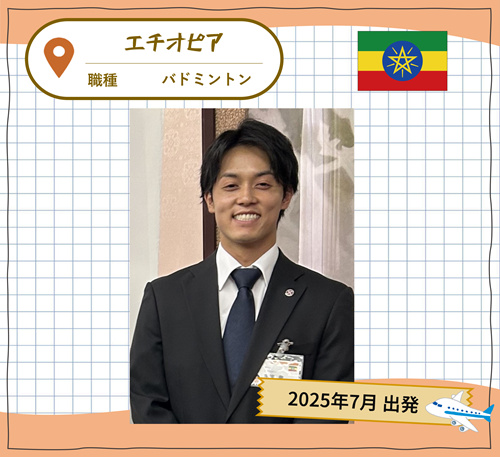 バドミントン隊員としてエチオピアの首都、アディスアベバ市にて現地の8~13歳の子ども達を対象に選手とコーチの指導・育成を行う予定です。しかし、バドミントンを行うにあたっての環境は非常に芳しくない為、指導するとともに環境作りをはじめ様々な現状改善・向上を図りたいと思います。また、バドミントンの普及活動も行いつつ、「スポーツや体育」を通じて地域の活性化、人々の協調性や豊かな人間力を育む一助を担えるよう、現地の方々と楽しく全力で取り組んで参りたいと思います。