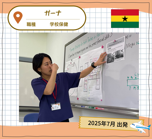 ガーナの小中学校で健康教育に携わります。自分の健康は自分で守り、より良く未来を生き抜くことができる子どもたちの育成と、安心安全で学業に集中できる学校づくりに貢献したいです。現職教員特別参加制度を利用して参加するため、帰国後に石川県の子どもたちと先生方に伝えられることを一つでも多く経験してきたいです。